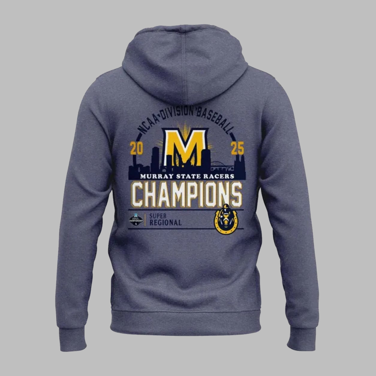 The back design tells the full story. A large championship-style graphic highlights Murray State Racers, the year 2025, and celebratory elements that mark the team’s success at the super regional stage. A city skyline motif adds depth and context, reinforcing the importance of Omaha as the final destination on the sport’s biggest stage.