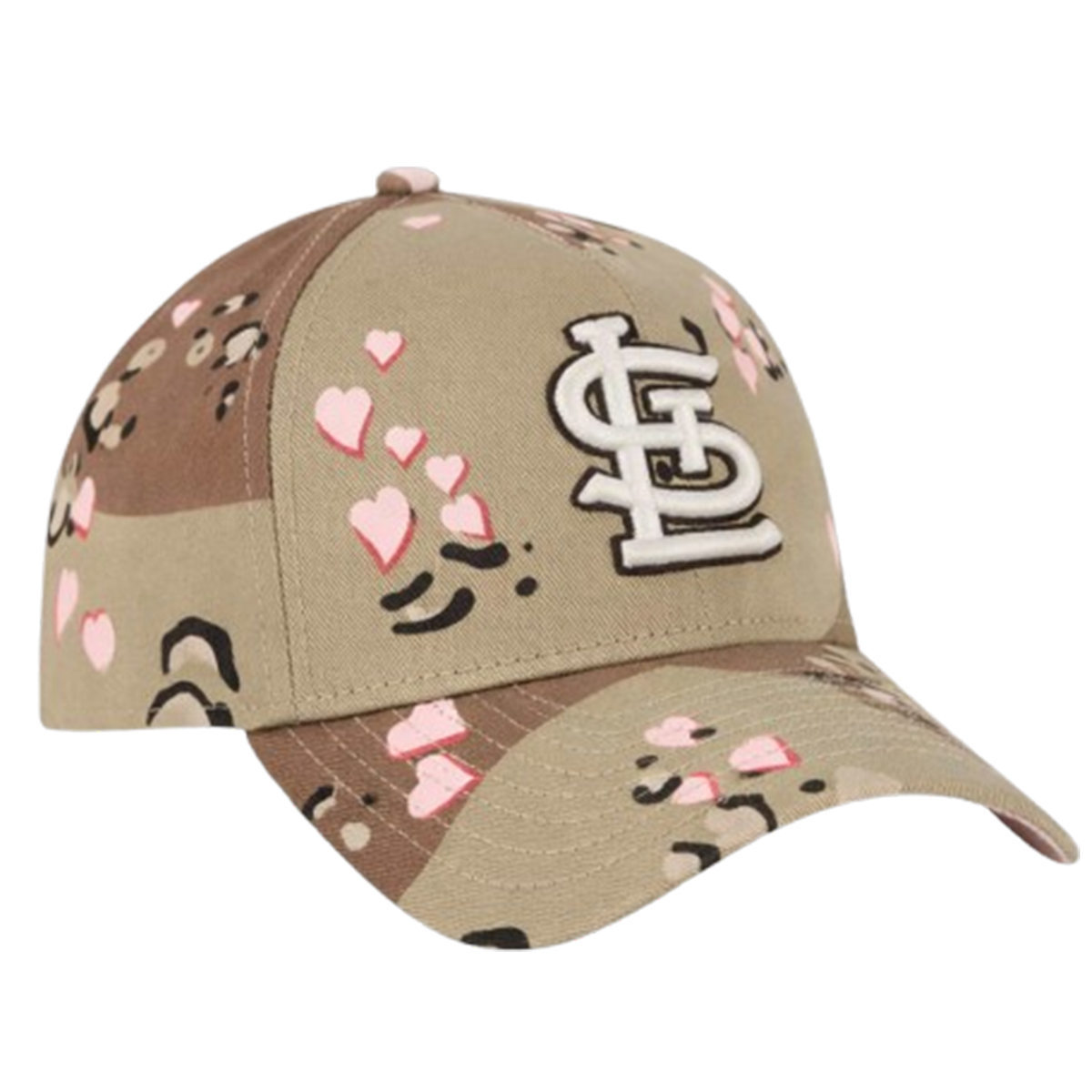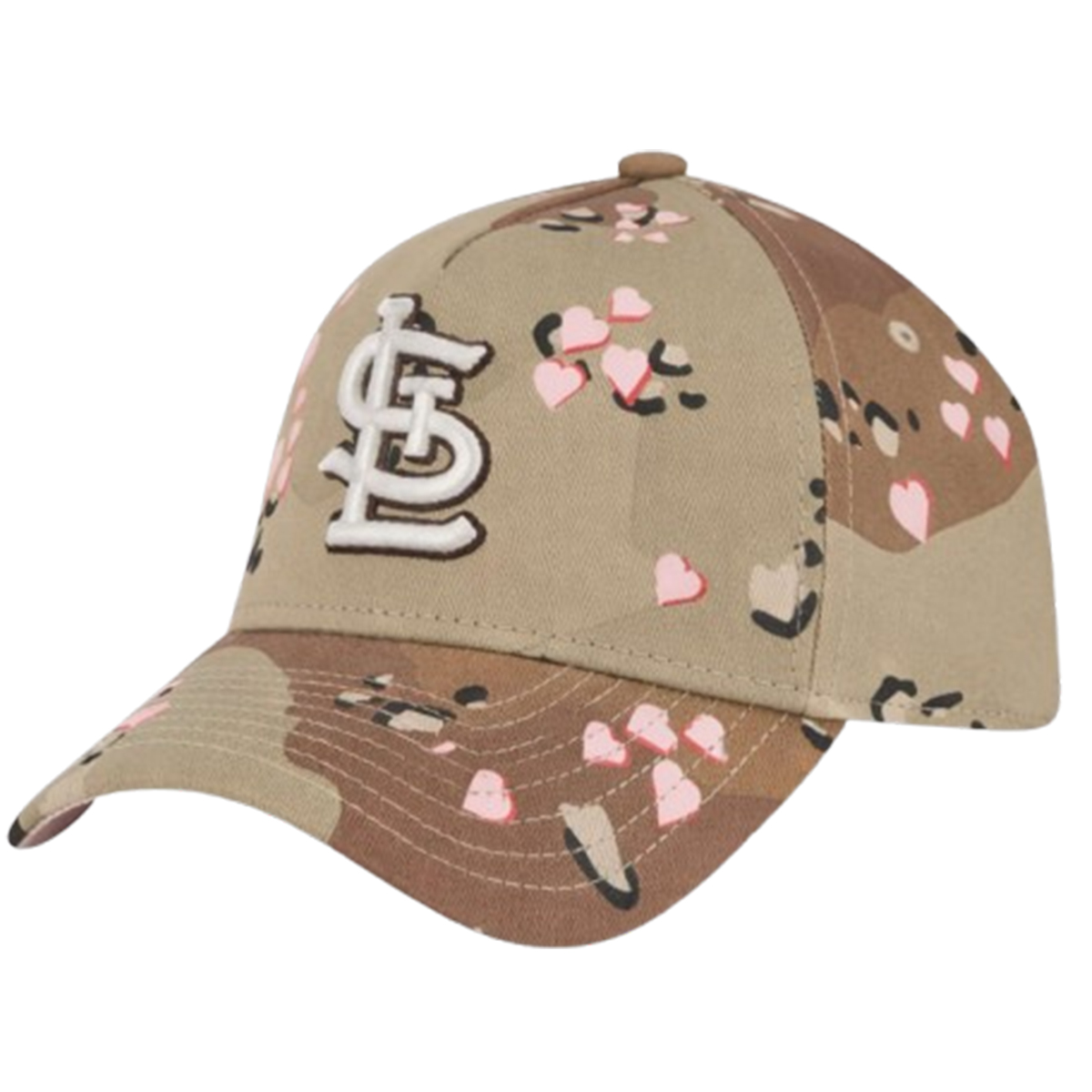 The St. Louis Cardinals Camo Hearts Valentine’s Day Hat 2026 features a desert-inspired camouflage pattern layered with scattered pink hearts across the crown and brim. Front and center sits the iconic interlocking “STL” embroidery, raised and clean, offering strong visual contrast against the camo base. The structured crown keeps its shape, while the curved brim gives the hat an easy, wearable profile suitable for daily outfits. Each heart detail is thoughtfully placed, adding Valentine flair without overwhelming the overall design.