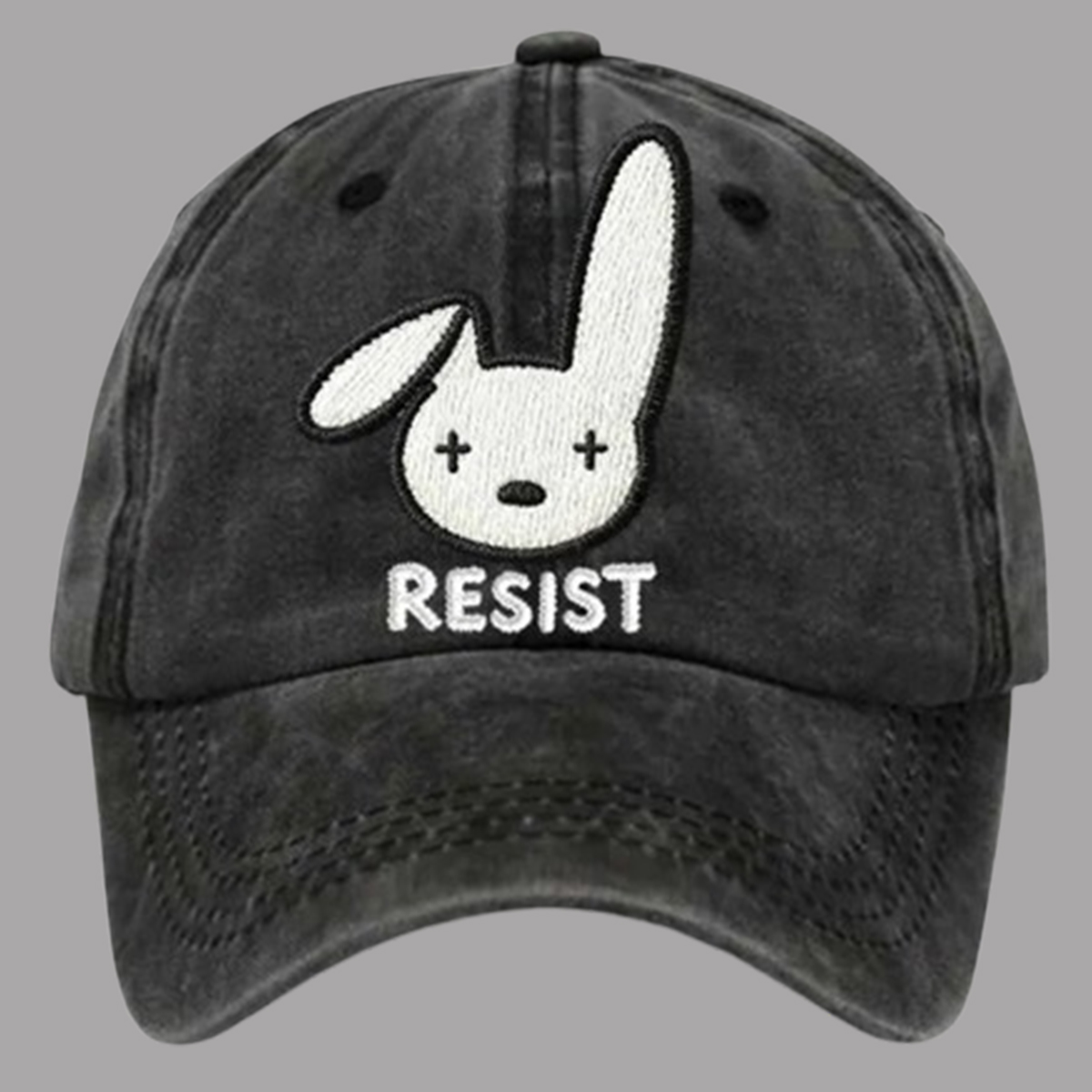 This cool, distressed blue cap features a powerful yet charming design. Dominating the front is a clean, embroidered white bunny head logo with long, distinct ears, and two subtle cross symbols for eyes, giving it a unique, edgy character. Below the graphic, the word “RESIST” is boldly embroidered in a clear white thread. This graphic combination is more than just a fashionable accessory; it’s a subtle cultural commentary. The well-known bunny symbol, often associated with a global music sensation, paired with the word “RESIST,” transforms the hat into a witty emblem of non-conformity and individuality.