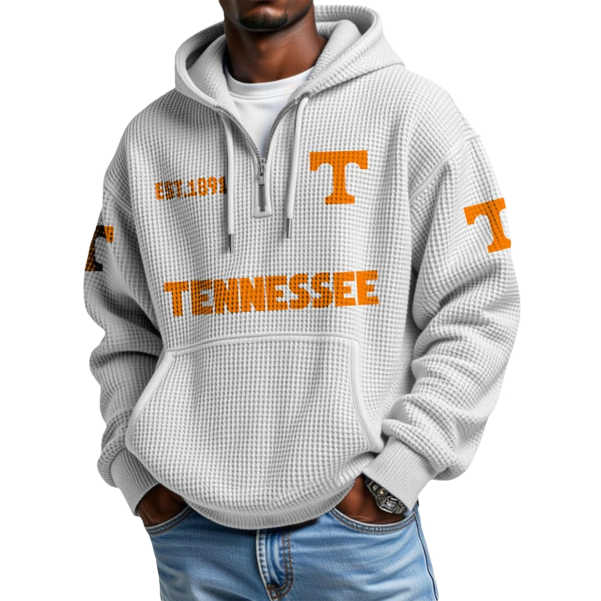 This hoodie features a crisp light-gray waffle-knit texture that instantly sets it apart from standard sweatshirts. The bold orange “TENNESSEE” lettering stretches across the chest in a clean, statement-making font, while the signature “T” emblem appears on both sleeves and the upper chest for full team energy. The “EST. 1891” detail near the shoulder adds a subtle nod to the program’s long-standing legacy. The half-zip neckline allows for adjustable comfort, making it easy to style for fall weather, winter wind, or mild spring days.