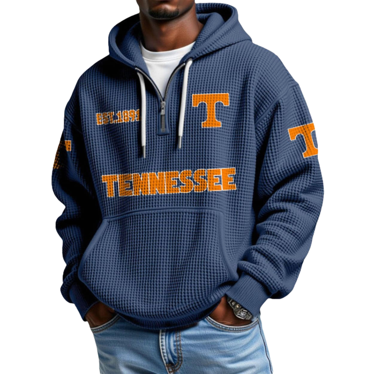The Tennessee EST 1891 College Football Half Zip Waffle Hoodie is the perfect blend of comfort, heritage, and standout team style. Designed for those who want to represent Tennessee with pride while staying warm and relaxed, this hoodie brings a powerful presence to everyday wear.