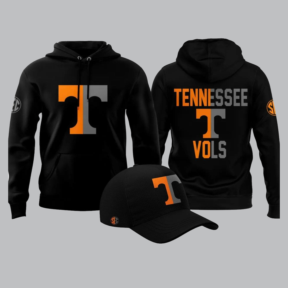 This premium hoodie features a striking design set against a deep, solid black canvas, which serves to make the custom graphics pop with incredible intensity. The focal point of the front is the iconic “T” logo, but with a unique twist: it is split vertically, featuring the classic bright orange on the left and a cool, steel grey on the right. This two-tone aesthetic continues on the back of the garment, where “TENNESSEE” is boldly arched across the shoulders in the same split-color font, sitting above a central “T” logo and the word “VOLS” anchored at the bottom. The left sleeve is accented with a circular emblem, adding a touch of athletic authenticity to the design.