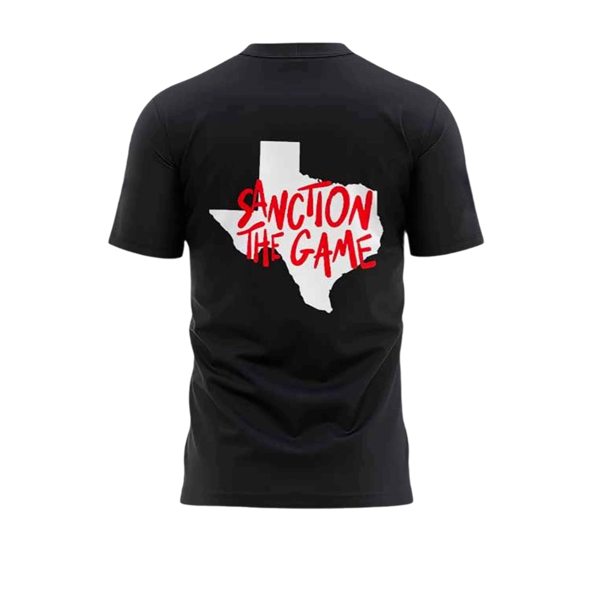 On the back, the design delivers its knockout punch: a bold outline of the state of Texas paired with the words “Sanction The Game.” This combination transforms the shirt into more than fan apparel, it becomes a statement about readiness, legitimacy, and demanding recognition on a bigger stage. The contrast of red and white graphics against the black fabric amplifies the impact, ensuring the message stands out from every angle.