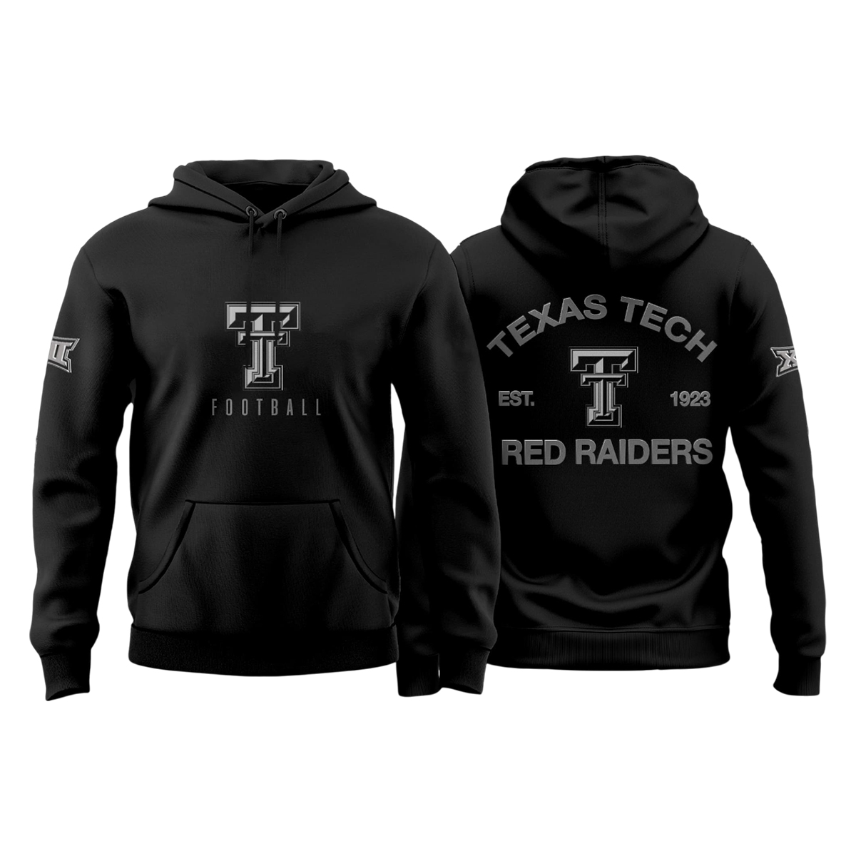 This hoodie features a deep black base that sets the tone for a clean, commanding design. The front displays a sharp “Double T” emblem paired with the word “Football,” centered and balanced for a minimalist yet aggressive look. On the back, bold arched lettering reads “Texas Tech Red Raiders,” complemented by “Est. 1923,” grounding the design in decades of history and pride.