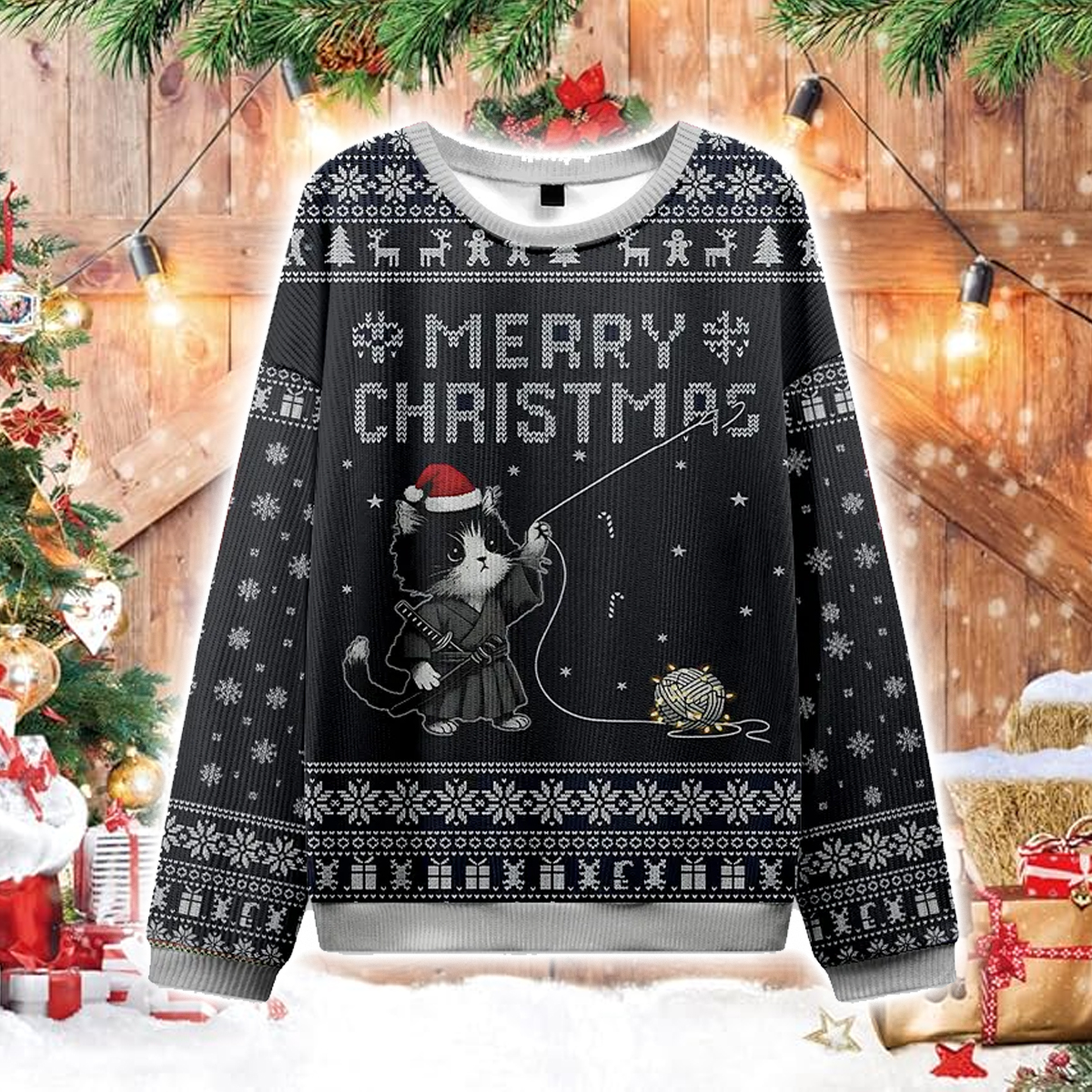 This sweater captures a moment of perfect holiday chaos! The centerpiece is a comical scene of a samurai cat, complete with a Santa hat, playfully pulling on a string of yarn that is unraveling the words MERRY CHRISTMAS. This clever central graphic is set against a classic ugly sweater background featuring festive patterns of snowflakes and reindeer.