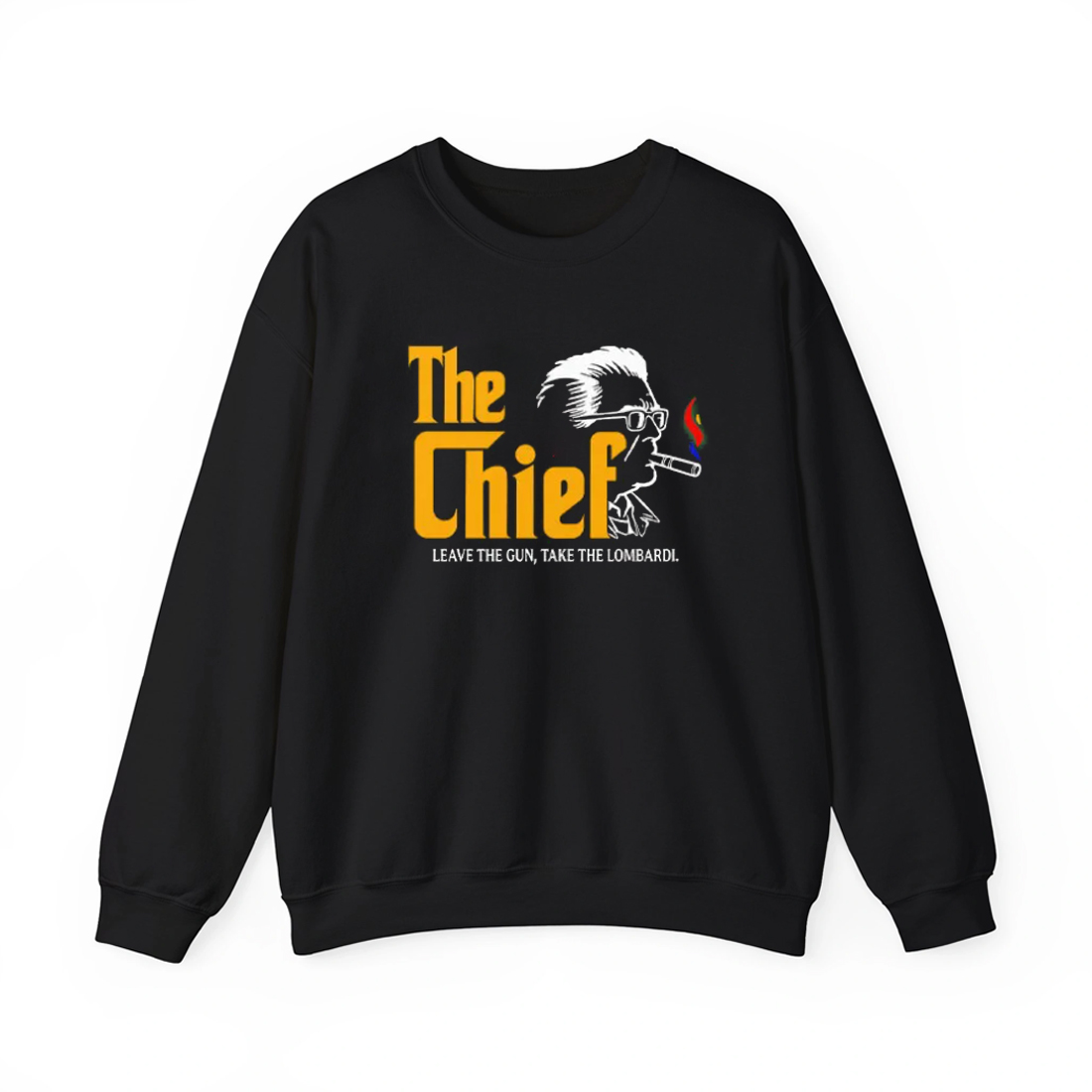 The The Chief Leave The Gun Take The Lombardi Shirt features a sharp and creative graphic on a sleek black background. Bold golden-yellow text spells out The Chief, stylized in a way that nods to iconic gangster films, while a silhouette of a confident coach with slicked-back hair and a lit cigar brings charisma and edge to the design. The line beneath, “Leave the gun, take the Lombardi,” is a clever twist on a legendary movie quote, tailored perfectly for football fans who know exactly what the real prize is.