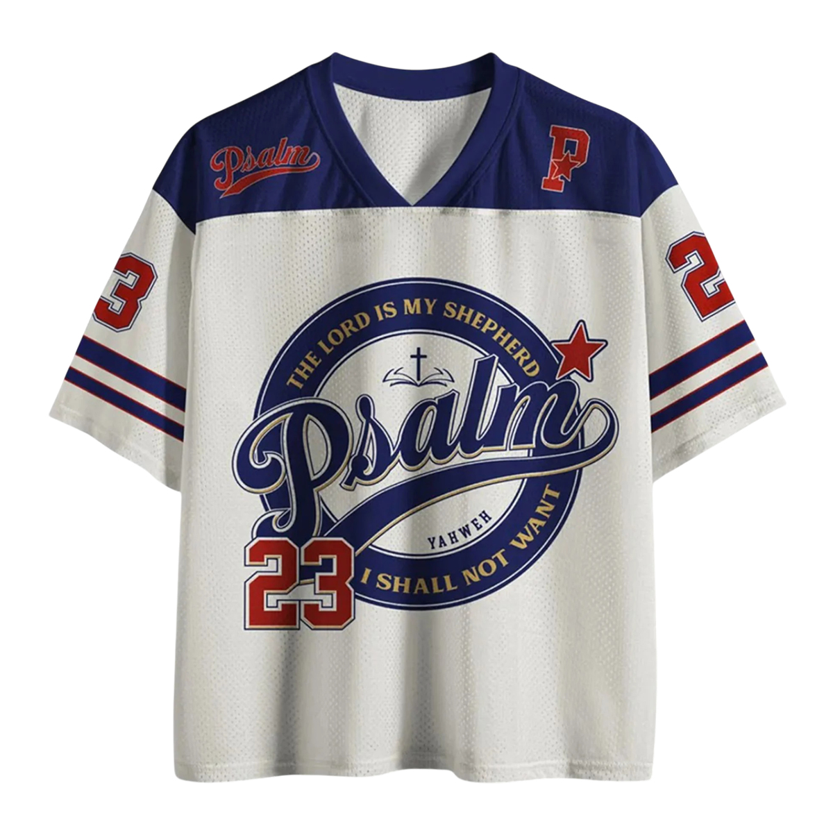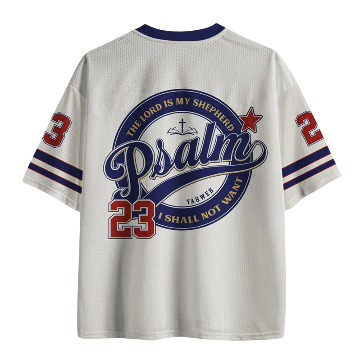 This jersey features a breathable mesh construction and a striking front emblem showcasing the word “Psalm” in a script-style layout, paired with the iconic number 23, symbolizing the verse that has uplifted millions: “The Lord is my shepherd; I shall not want.” Surrounding the emblem is a circular badge integrating subtle icons of faith, including a cross and guiding imagery that highlights the message of divine protection. The back of the jersey mirrors the same bold emblem, ensuring the message remains visible from every angle. Accented sleeve stripes, contrast neckline, and embroidered-style lettering on the chest give the jersey a classic athletic feel while keeping its spiritual theme at the center.