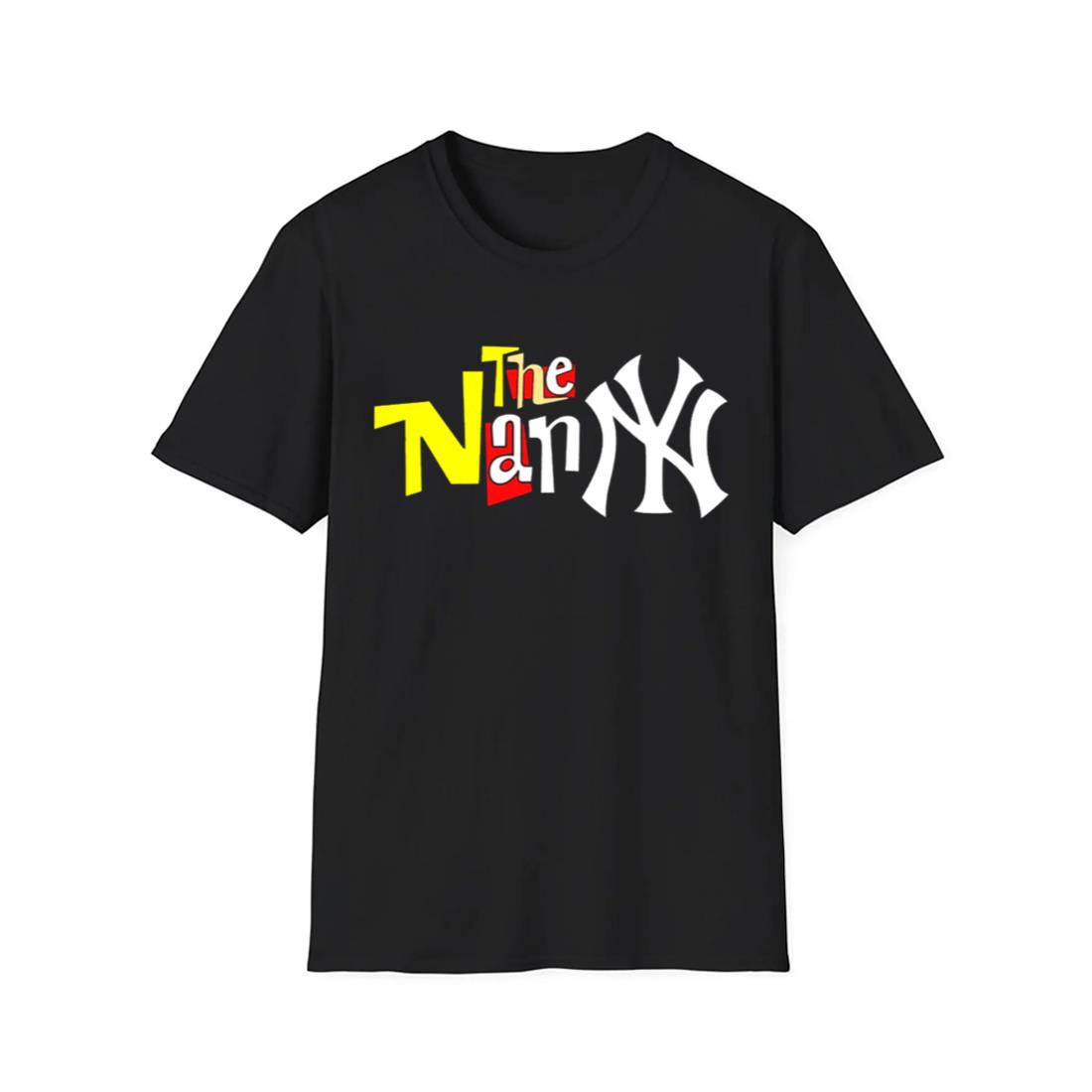 The shirt features a black background with the uniquely designed The Nanny text. The top features the fun colors of the famous sitcom, the bottom NY is stylized after the New York Yankees logo. The design playfully blends TV and sports culture, creating a highlight that is both unique and personal.