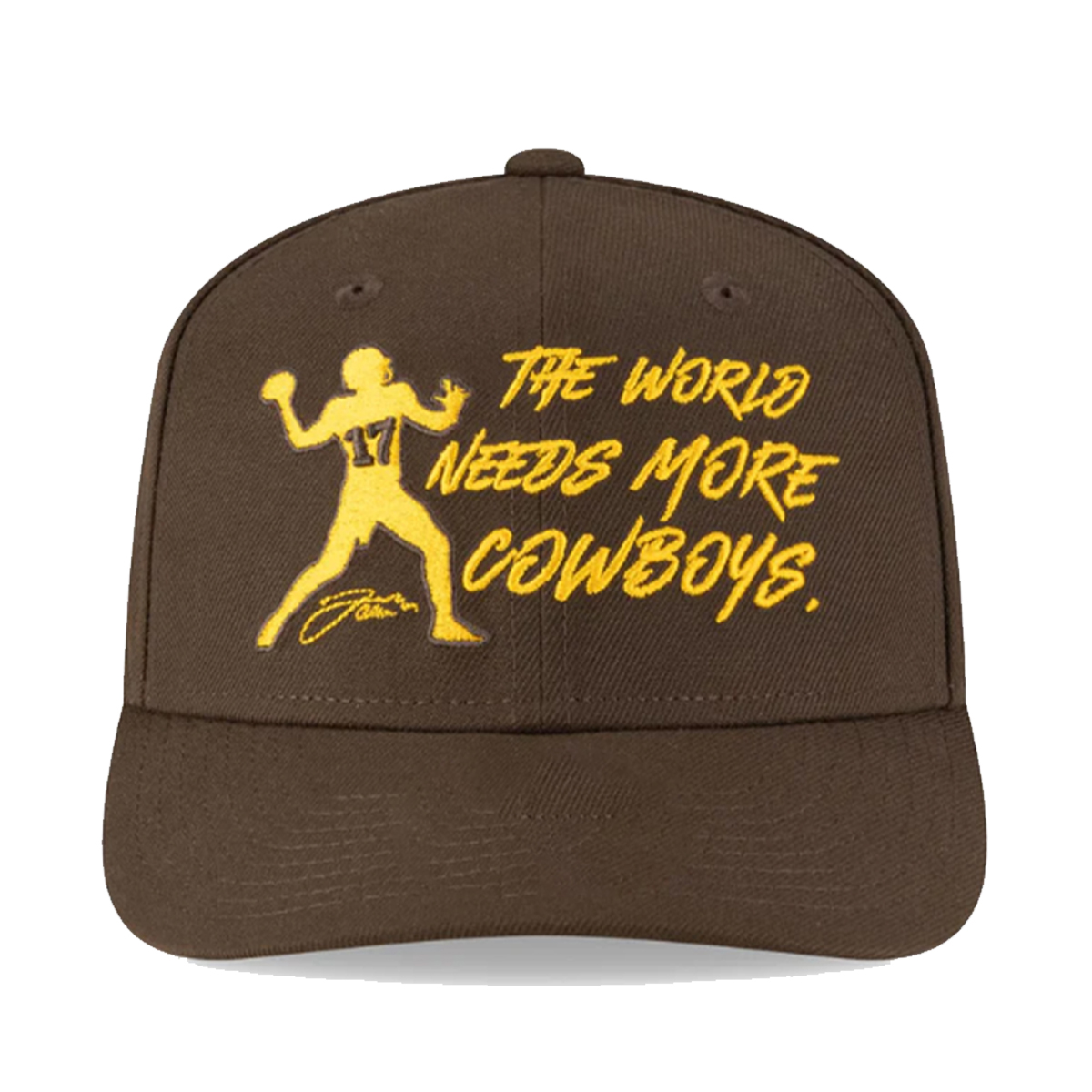 Showcasing a striking silhouette of a quarterback mid-throw, the The World Needs More Cowboys Josh Allen Signature Hat features the number 17 in bright gold and Josh Allen’s signature beneath the figure. The hand-lettered phrase “The World Needs More Cowboys” is embroidered across the front in matching gold, offering a powerful reminder of courage, toughness, and staying true to your roots. All of this sits on a rugged brown canvas that’s structured, clean, and built to last.