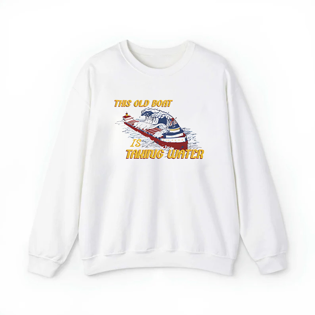 This premium-quality, white cotton t-shirt features a bold, vintage-style graphic depicting a freighter battling a towering wave. The ship, rendered in patriotic colors of red, white, and blue, is dramatically pitching into the water. Dominating the foreground is the poignant, distressed text: “THIS OLD BOAT IS TAKING WATER.” The artwork is a vibrant and respectful artistic representation of the forces of nature encountered by the mighty lake vessel.