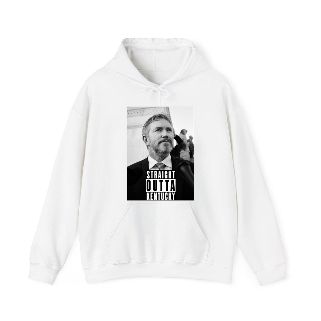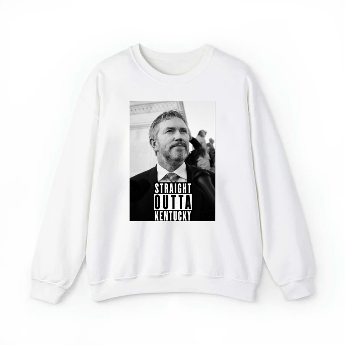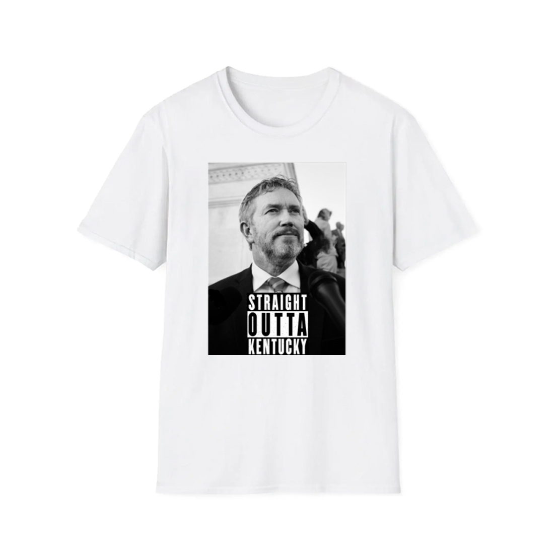 This premium white t-shirt features a high-contrast black-and-white photo of Thomas Massie, overlaid with the iconic “Straight Outta Kentucky” text in bold block letters. The striking design is printed on soft, breathable fabric, making it ideal for everyday wear, rallies, or casual meetups. With its sharp visual and clear message, this shirt makes a strong statement while keeping you comfortable and stylish.