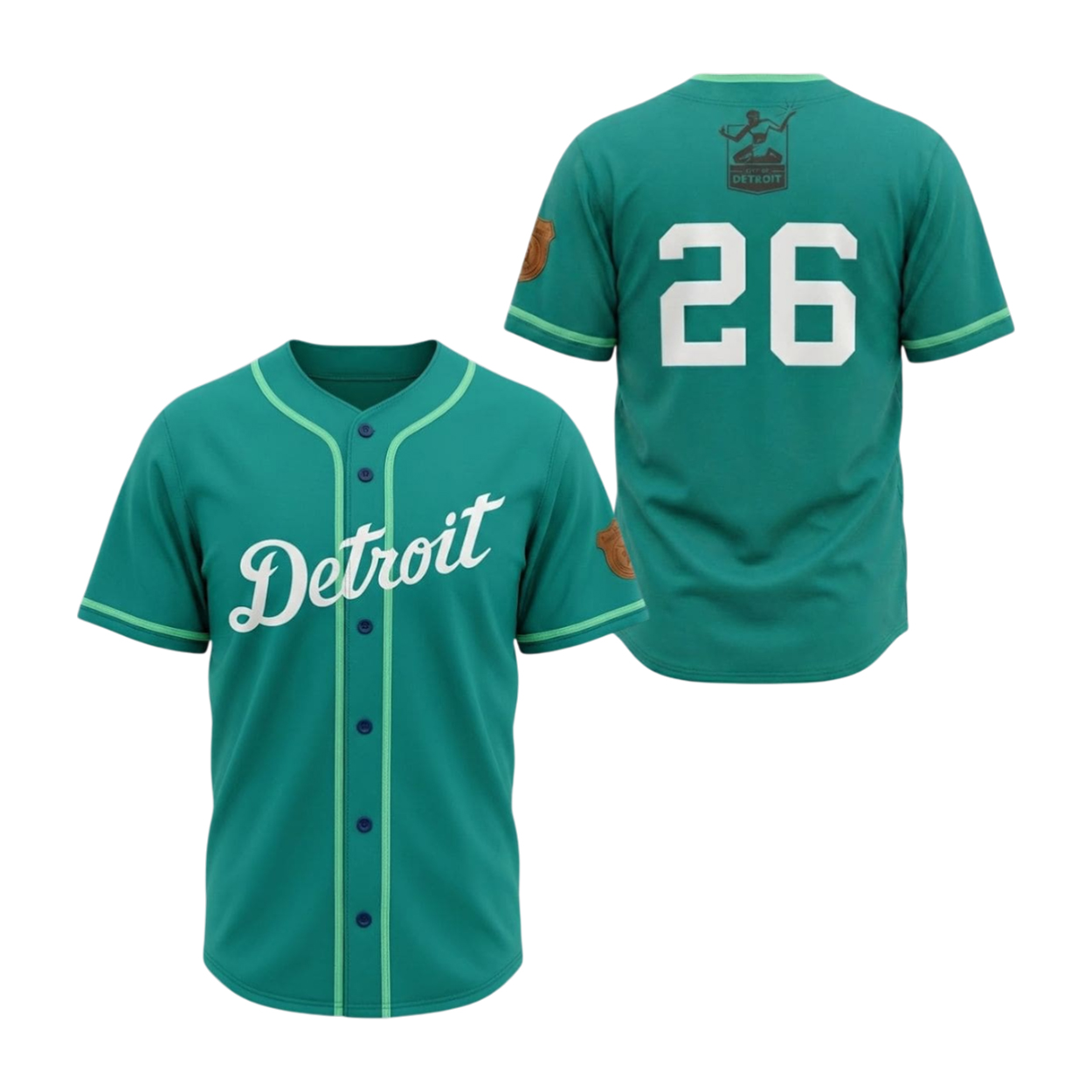 The Tigers 2026 Law Enforcement Jersey Giveaway features a striking teal-green base that immediately sets it apart from traditional designs. Across the front, the flowing “Detroit” script appears in crisp white, framed by contrasting trim along the button placket and sleeves for a clean, balanced look. The back displays the number “26” in bold white lettering, marking the season and reinforcing the commemorative nature of the jersey. Subtle badge-style patches on the sleeves and upper back add depth and meaning, referencing Law Enforcement recognition without overpowering the overall aesthetic. The short-sleeve, button-front silhouette keeps the jersey classic and wearable, while the modern color choice gives it a fresh identity.