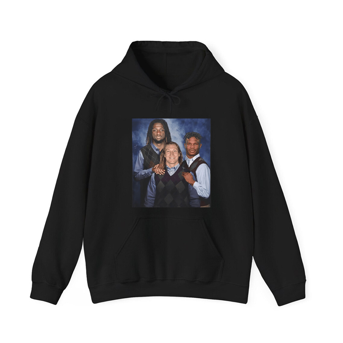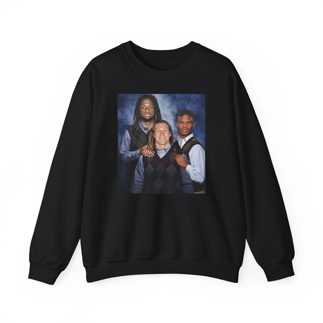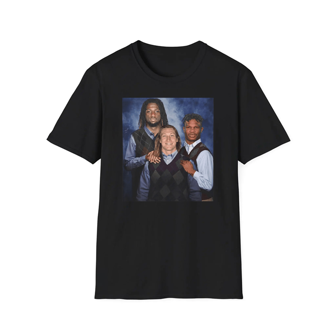 At the center of the Travis Hunter Trevor Lawrence Brian Thomas Jr. Step Brothers Shirt is a vintage-style studio portrait graphic that instantly grabs attention. The three athletes are styled in matching sweater-vest outfits, posed closely together in a way that mirrors iconic comedy family photos from the early 2000s. The contrast between the formal, almost awkward pose and the real-life competitive edge of these players creates the humor that makes this design work so well.