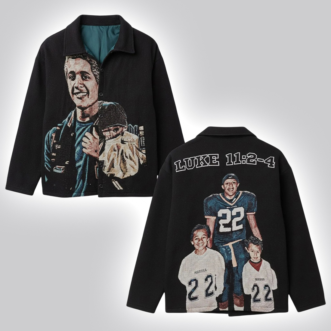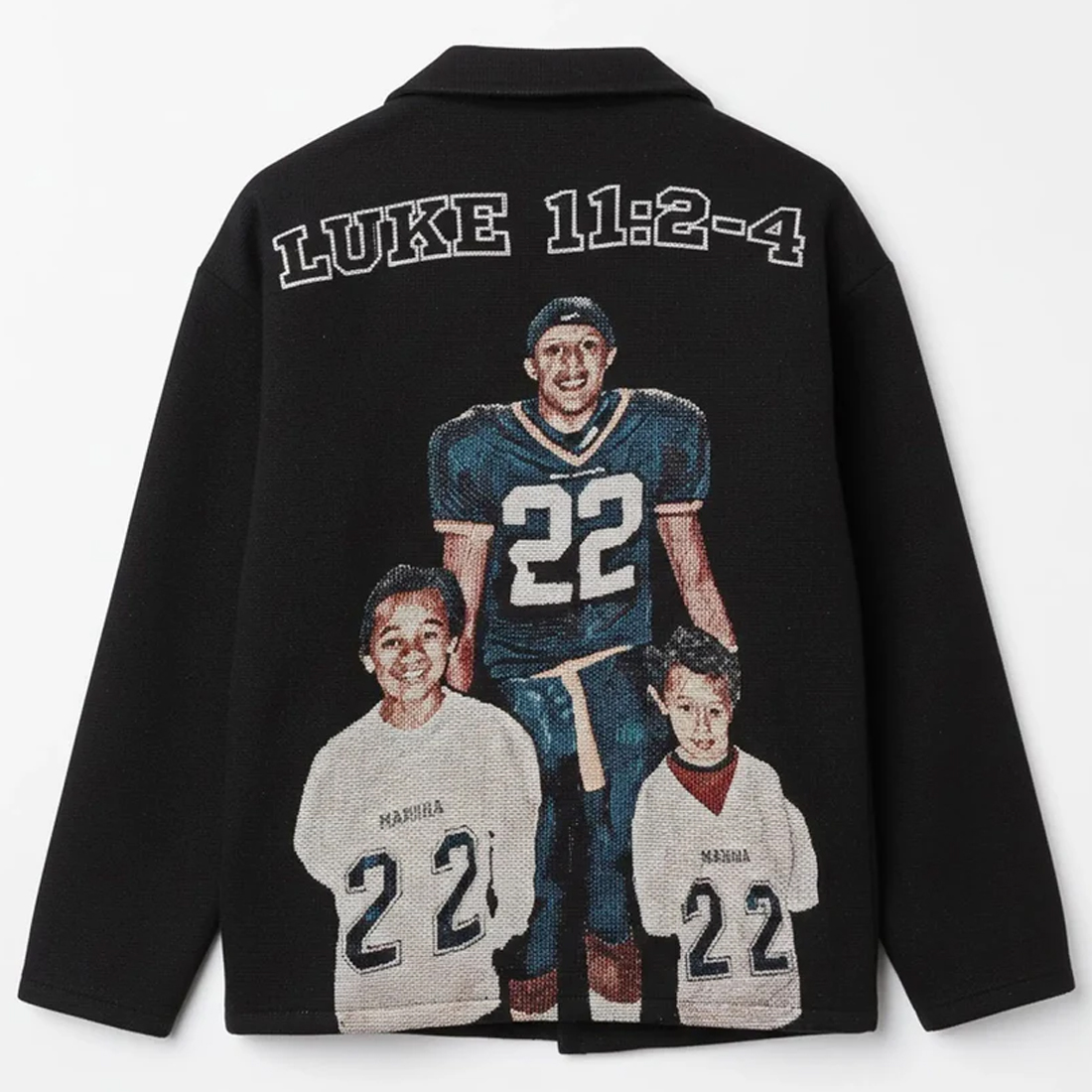 The back of the garment is the true centerpiece, displaying the bold text “LUKE 11:2-4” across the shoulders, referencing the Lord’s Prayer. Below the scripture, a detailed graphic depicts McDuffie in his #22 jersey, flanked by the next generation of athletes, symbolizing mentorship and legacy. The jacket is finished with a classic turn-down collar, sturdy button-down closures, and a relaxed, boxy fit that is perfect for layering over hoodies or t-shirts. The color palette uses deep blacks and rich neutrals, ensuring the imagery pops without being overwhelming.