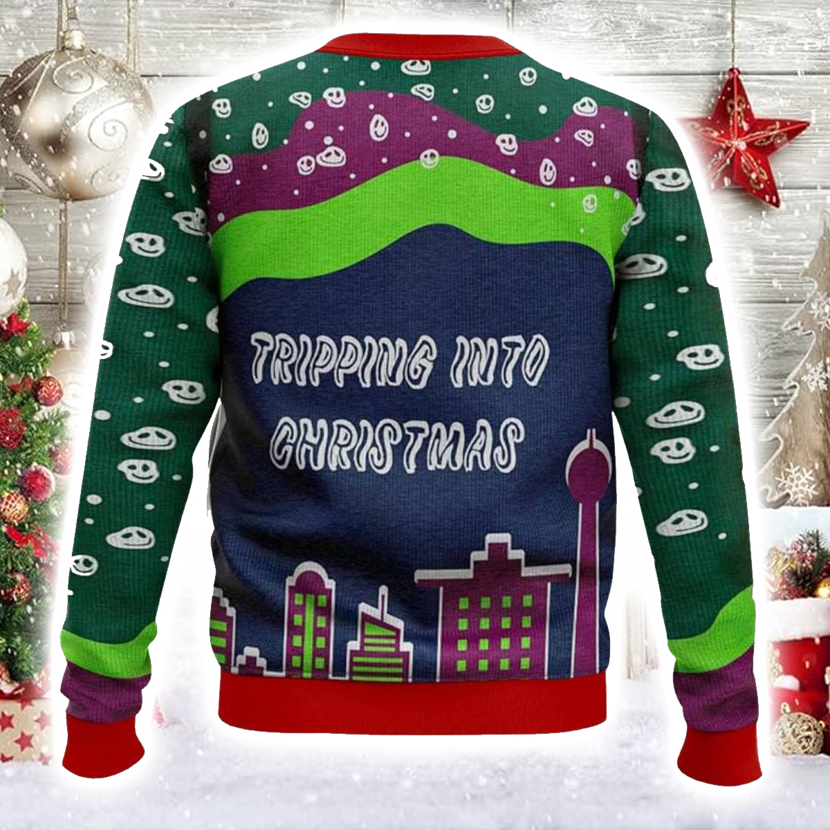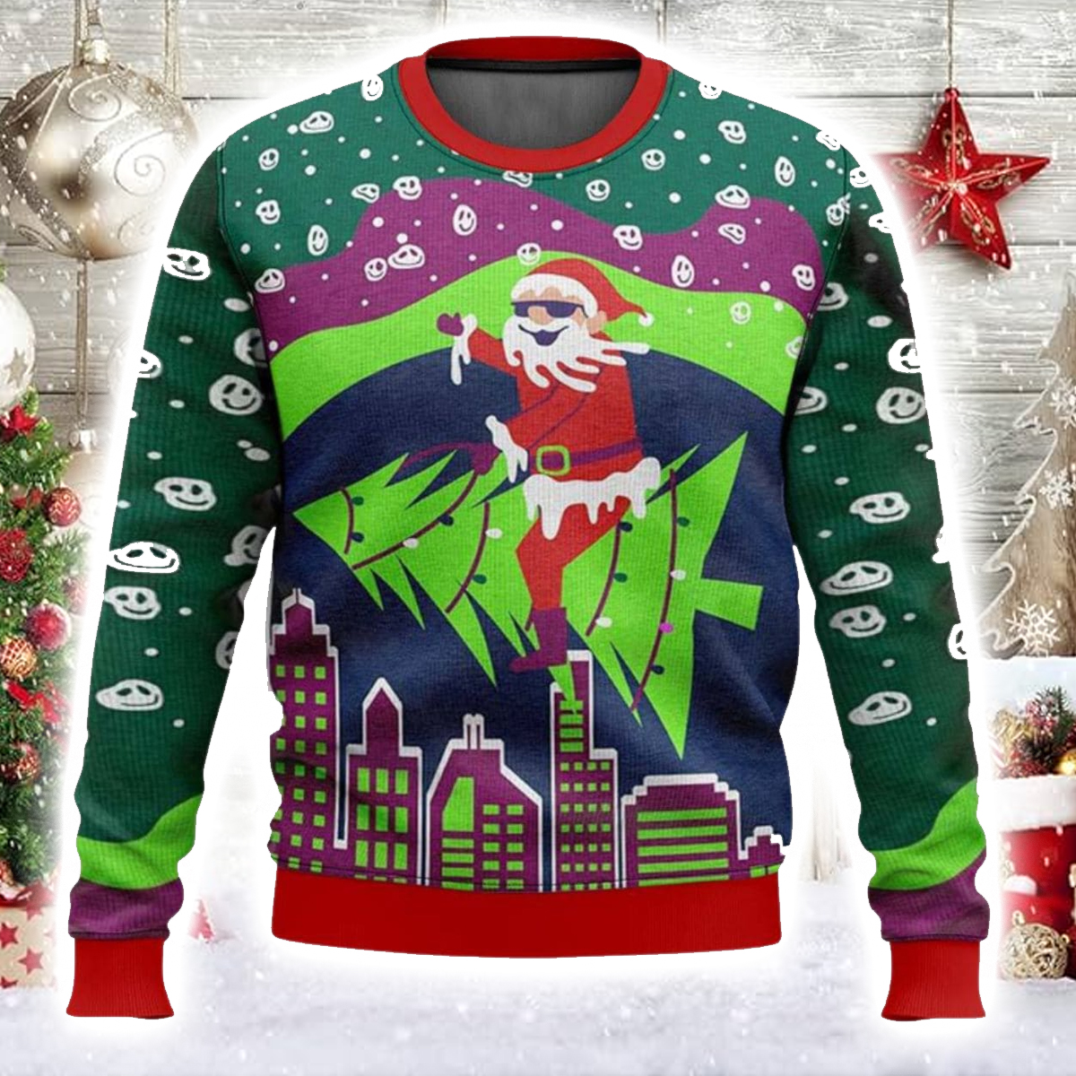 The Tripping Santa Ugly Christmas Sweater features an eccentric design bursting with neon hues and surreal details. Santa, rocking his iconic red suit and shades, rides a bright green Christmas tree soaring above a glowing city skyline. The swirling purple and green background and scattered smiley faces give it that retro, slightly chaotic look like Christmas through a kaleidoscope. It’s weird, it’s funny, and it’s unapologetically festive.