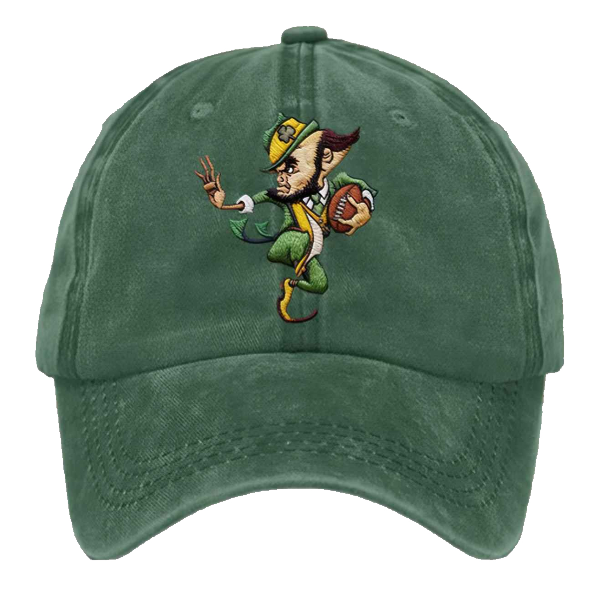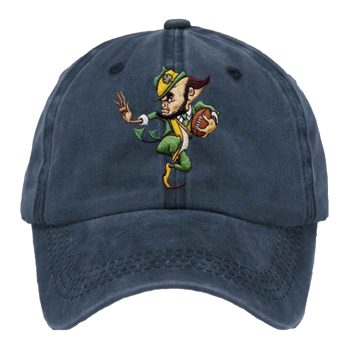 This cap features a beautifully weathered navy finish that instantly gives it a classic, lived-in look. On the front is an embroidered figure in vibrant green and gold, mid-action with a football tucked under one arm—a design widely associated with the bold, determined attitude of Notre Dame athletics. The stitching is crisp and colorful, standing out vividly against the cap’s vintage-washed fabric. This design reflects a heartfelt nod to the traditions celebrated at campus events, rivalry weekends, and memorable game-day moments that unite supporters year after year.