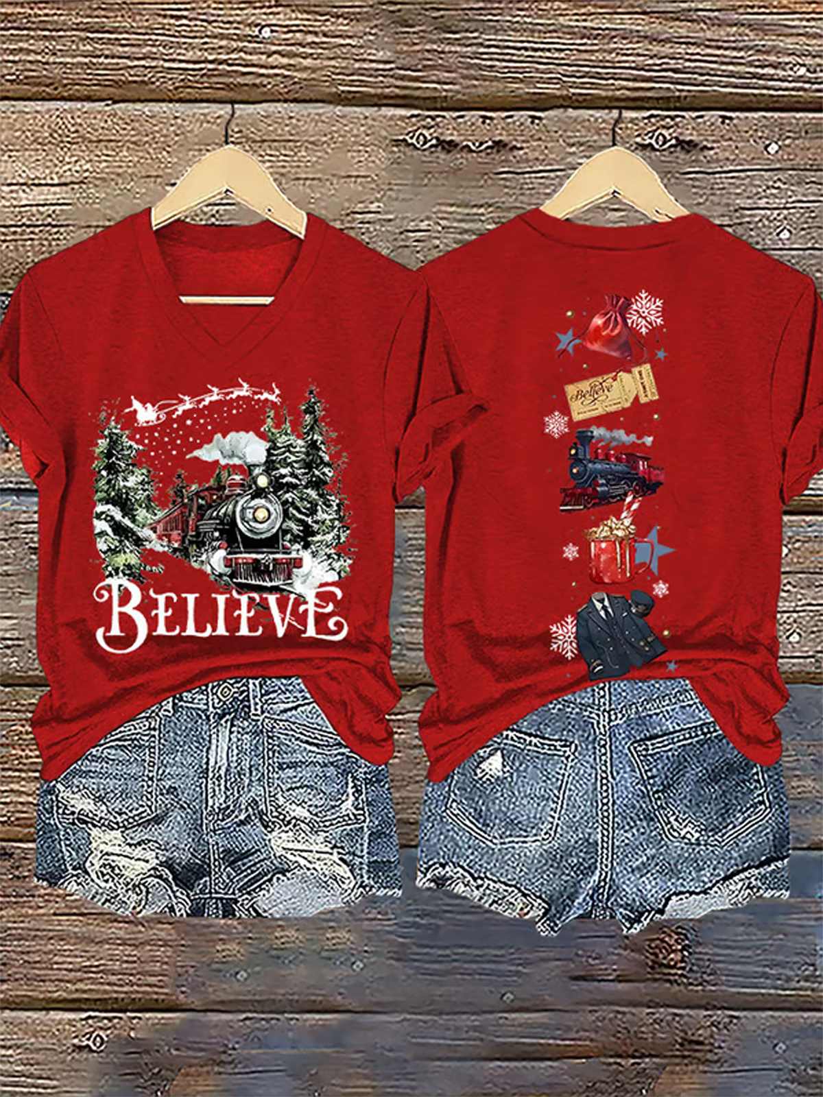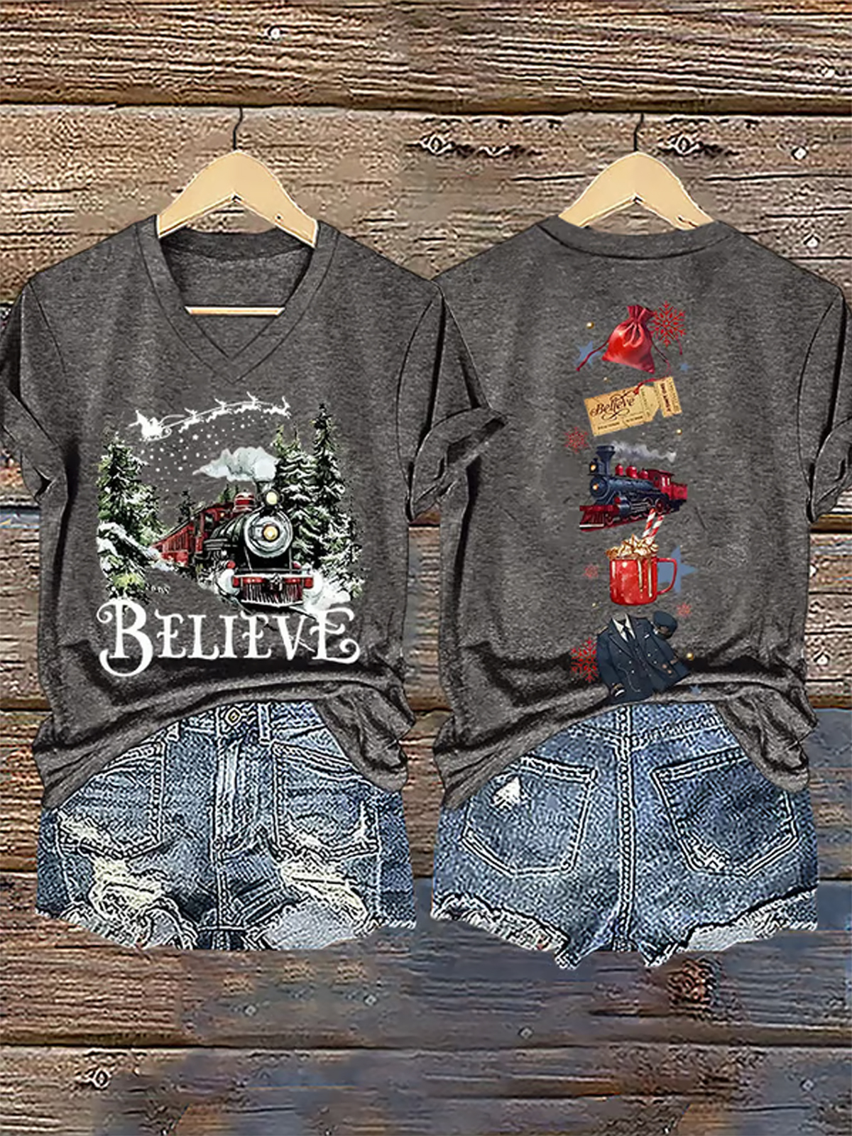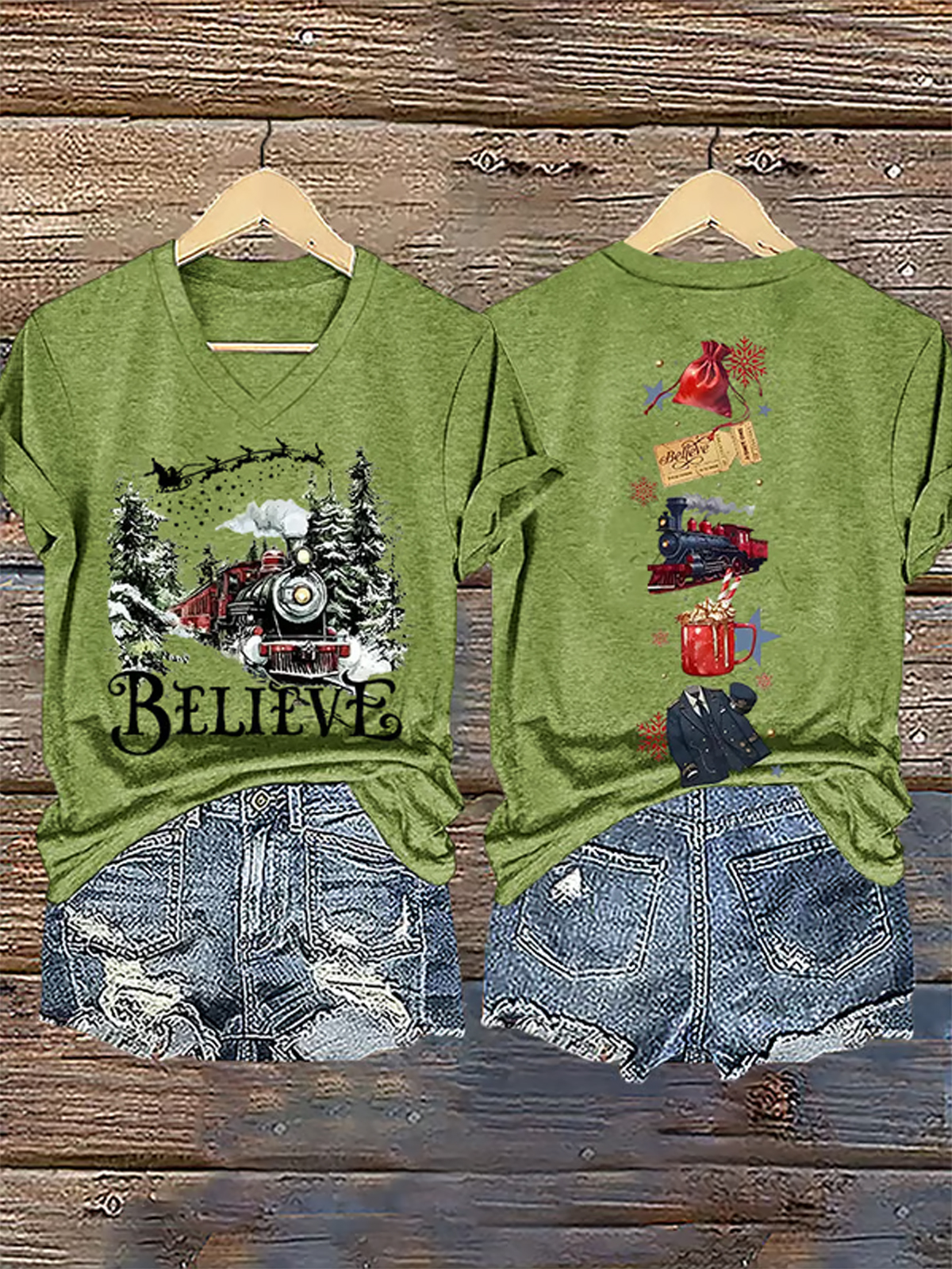 Step into the magic of the holiday season with the V-Neck Retro Christmas Believe Print T-Shirt, a festive favorite that combines vintage charm with heartfelt Christmas spirit. The V-Neck Retro Christmas Believe Print T-Shirt brings classic Christmas memories to life through its stunning design. On the front, a vintage red train steams through a snowy forest, its golden light glowing warmly against evergreen trees. Above it, Santa’s sleigh glides across the night sky, spreading magic and wonder. The word “BELIEVE” is beautifully printed beneath the scene, evoking a timeless message of hope and joy.