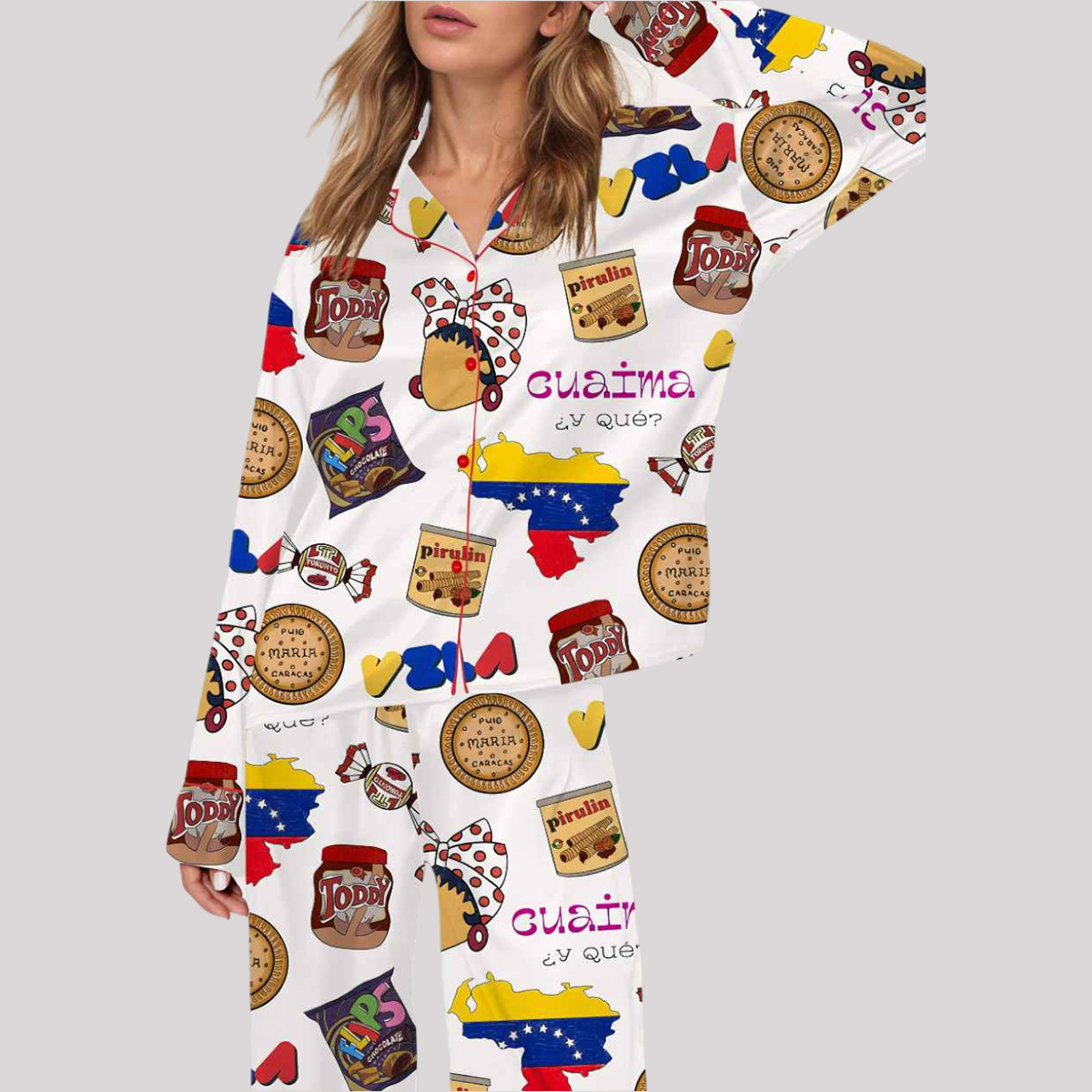 The Very Venezuela Silky Satin Pajama Set bursts with color and charm, showcasing iconic Venezuelan favorites like Pirulín, Toddy, Galletas María, and Chips, each symbolizing a sweet memory of home. The print also features the Venezuelan map in bright national colors, along with playful hearts and the phrase “Cuaima ¿y qué?”, a cheeky nod to Venezuelan slang that captures the country’s humor and spirit. Every element tells a story of pride, warmth, and cultural flavor.
