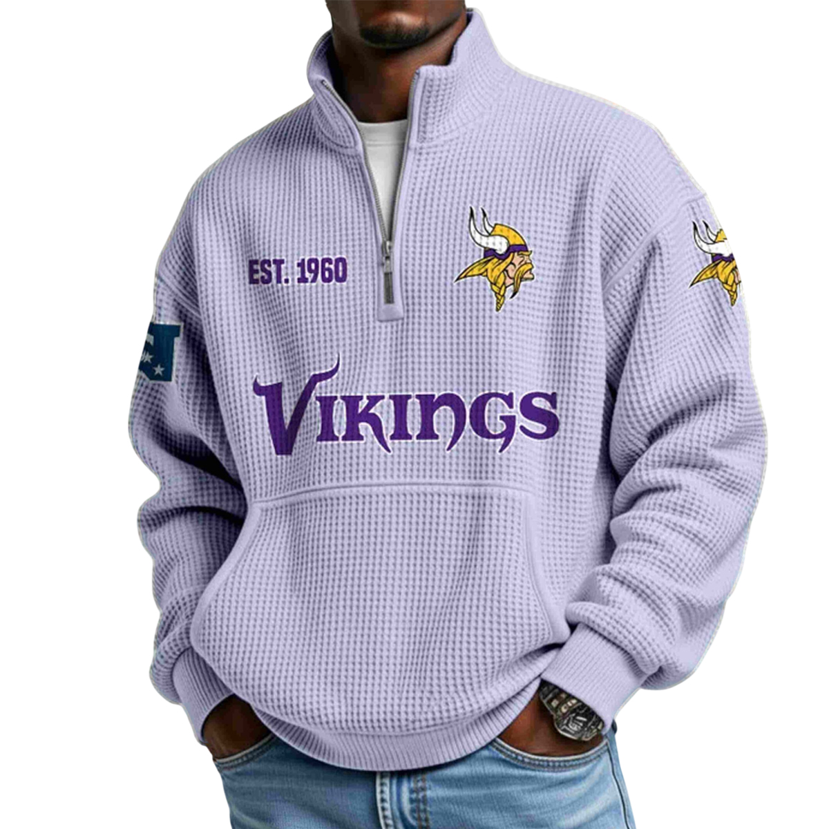 The product features a soft lavender waffle texture that feels premium yet relaxed, showcasing a unique visual pattern compared to typical winter fleece. Across the chest, bold purple “Vikings” lettering stands out sharply, while the front also includes an “EST. 1960” mark and a vibrant Viking-head emblem. These graphics appear again on both sleeves, giving the piece a confident, recognizable look from every angle. The half-zip closure allows easy layering and temperature control, while the large kangaroo pocket offers warmth and convenience. This hoodie fits naturally into the atmosphere of winter tailgates, rivalry gatherings, or special celebration events where supporters come together to represent their colors proudly.