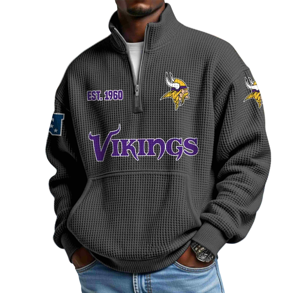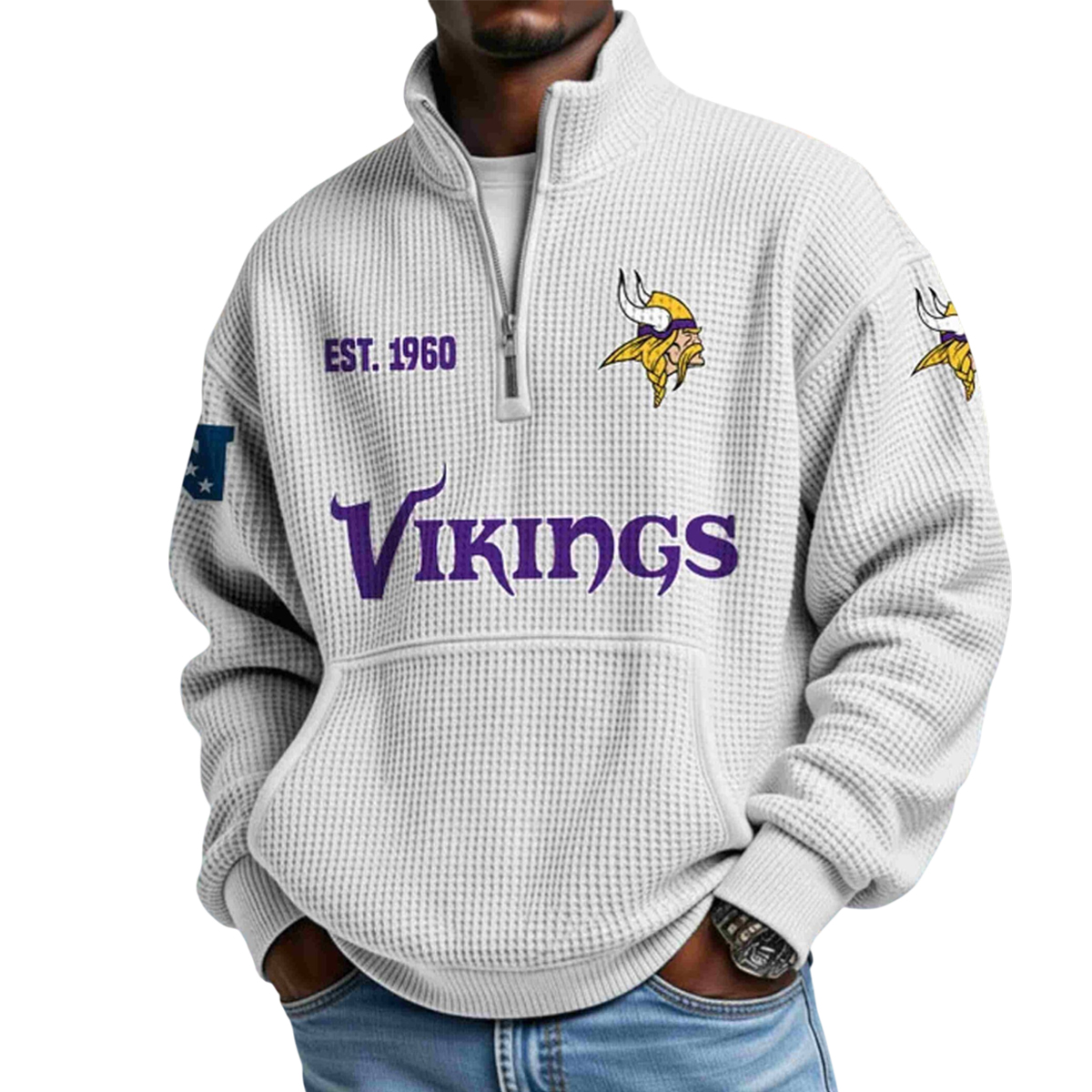 The Vikings EST 1919 Half Zip Waffle Hoodie is a warm, stylish, and heritage-inspired piece created for fans who appreciate both comfort and identity. With its textured waffle knit fabric and clean half-zip construction, this hoodie blends modern streetwear with classic team spirit.