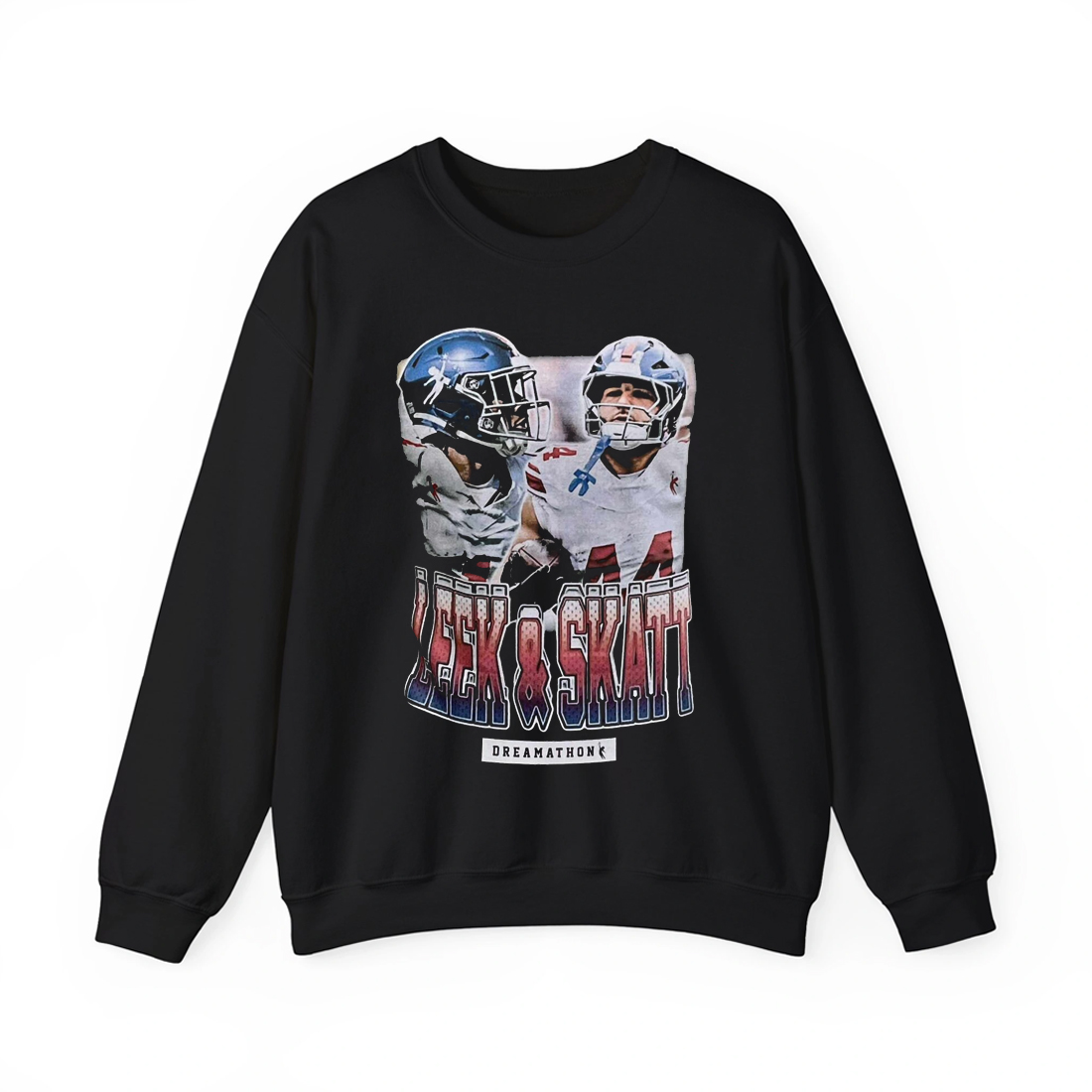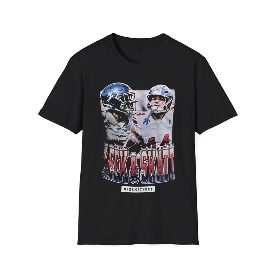 This standout T-shirt boasts a striking double-sided design on a comfortable black fabric. The front features a vintage-inspired graphic showcasing two athletes in their helmets, highlighted by bold, distressed lettering that reads LEEK & SKATT beneath them, and the word DREAMATHON underneath that. This design evokes a classic, fan-favorite aesthetic. The back of the shirt features a larger, captivating image of athletes celebrating, with one player looking toward the sky and the other beneath, set against a stadium backdrop. The large, stylized word DREAMATHON is printed prominently below this image, reinforcing the theme of big moments and aspirations.