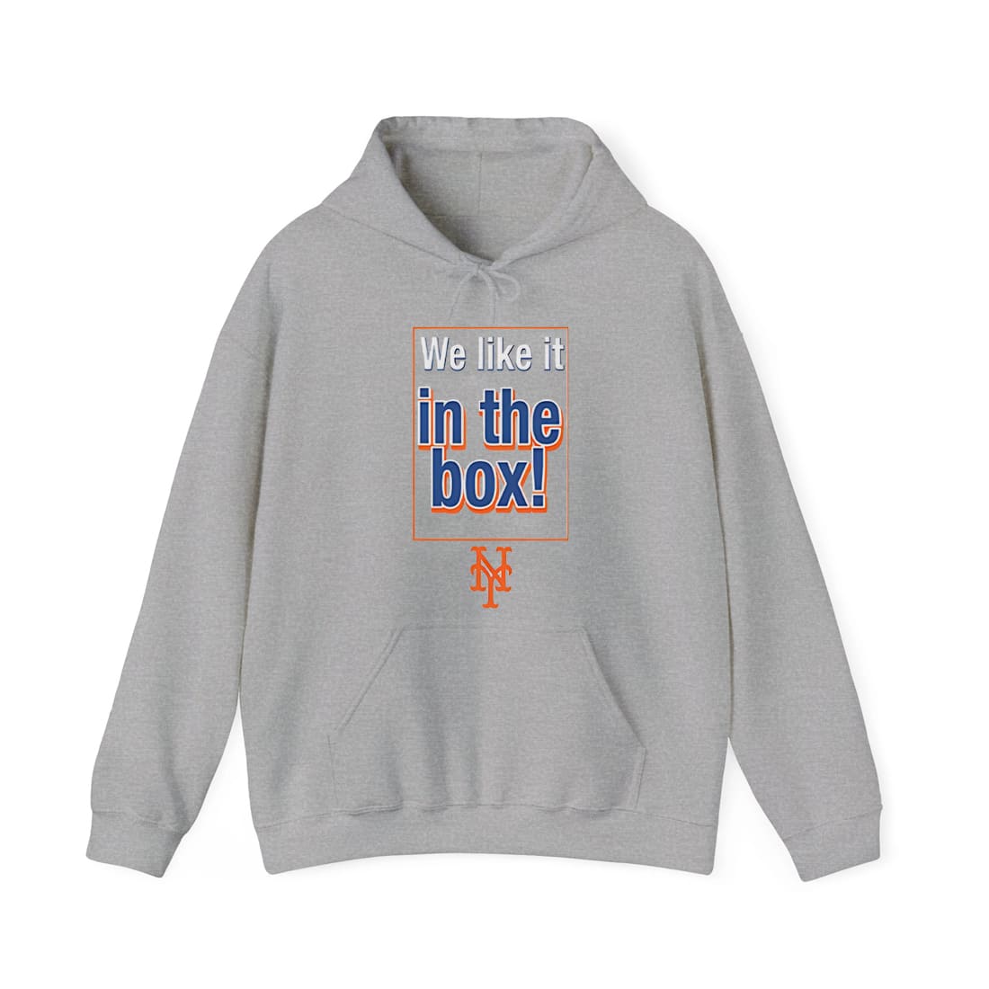 Printed on a classic heather gray cotton tee, this Mets-themed tee features an orange-outlined rectangle graphic with bold, layered text that reads: We like it in the box! Below the phrase is the instantly recognizable NY logo of the New York Mets, anchoring the shirt in baseball territory. At first glance, it’s hard to tell if this shirt belongs in a sports store or a cheeky novelty shop.