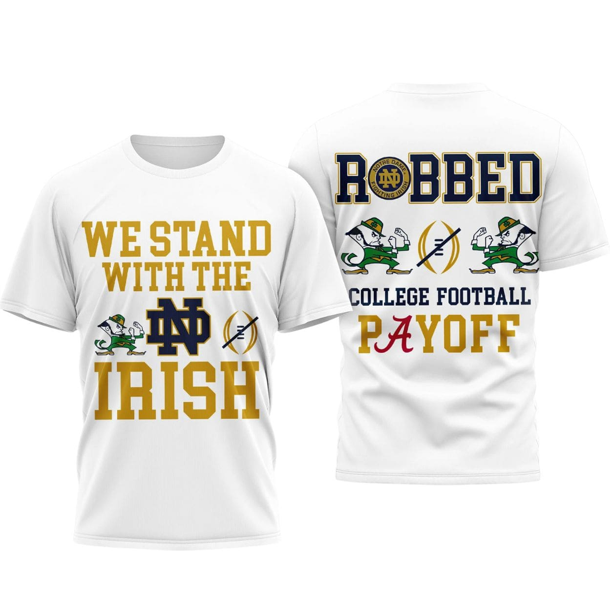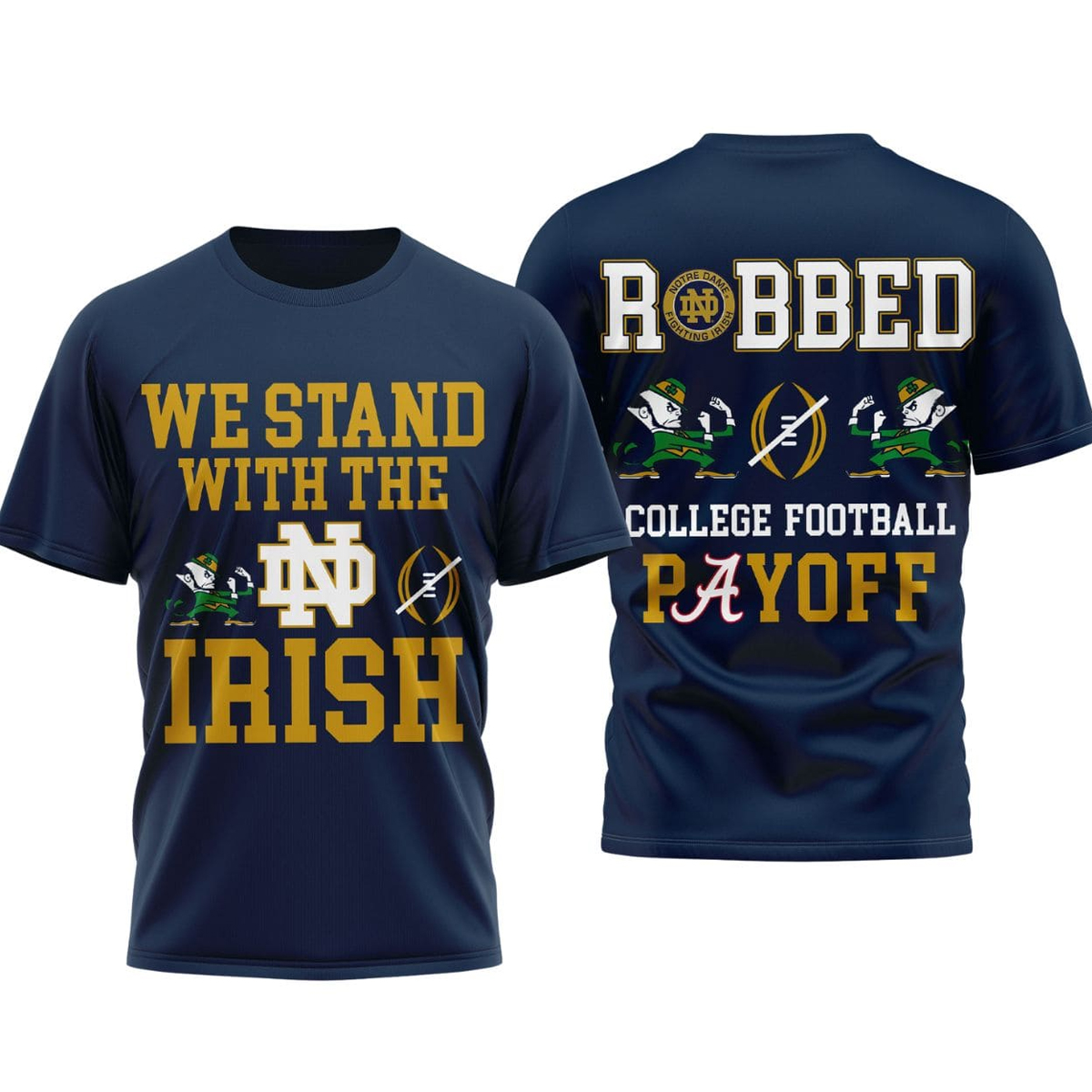 Designed around one of the most talked-about moments in recent college football history, this shirt reflects the widespread reaction to a playoff decision that left many fans feeling unheard. The bold front text, “We Stand With The Irish,” paired with symbolic graphics, represents unity and loyalty in the face of disappointment. On the back, the phrase “Robbed College Football Payoff” delivers a direct, unapologetic response to the outcome that sparked endless debate across sports media, fan forums, and social platforms.