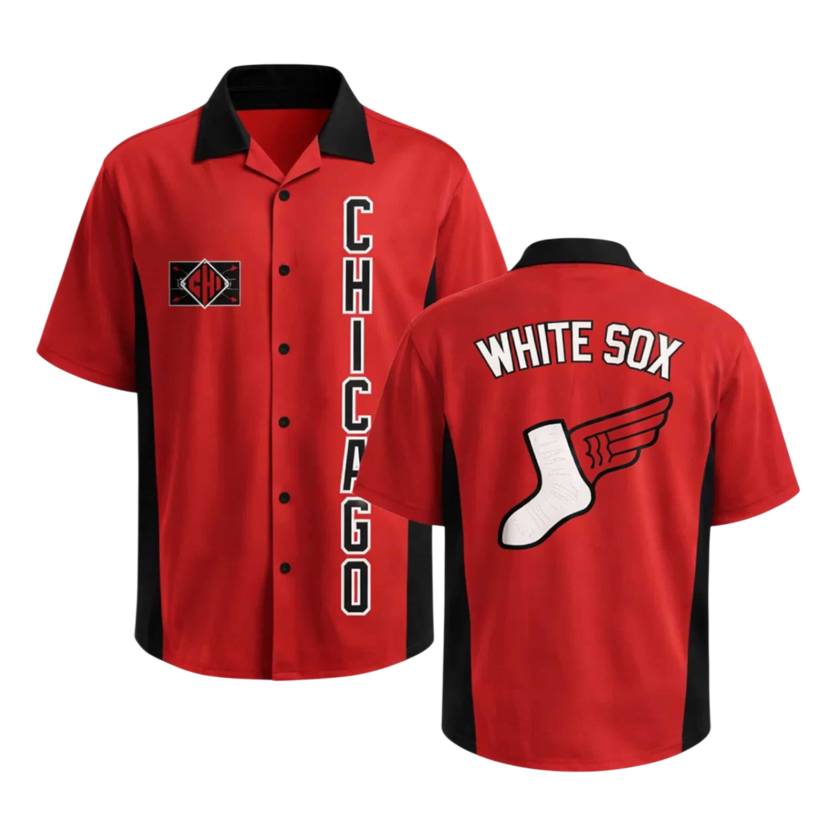 Visually, the White Sox City Connect Warmups Hawaiian Shirt Giveaway 2026 makes an immediate impression. The vibrant red base sets a confident tone, balanced by black side panels and a contrasting black collar that gives the shirt a sharp, structured look. Down the front, vertical “CHICAGO” lettering adds a bold architectural feel, while subtle geometric patches nod to City Connect design language. The back features “WHITE SOX” arched above a winged sock graphic, tying heritage symbols into a relaxed, short-sleeve Hawaiian-style silhouette. Button-up construction, breathable fabric, and a relaxed cut make this shirt ideal for warm weather, game nights, or casual streetwear styling.