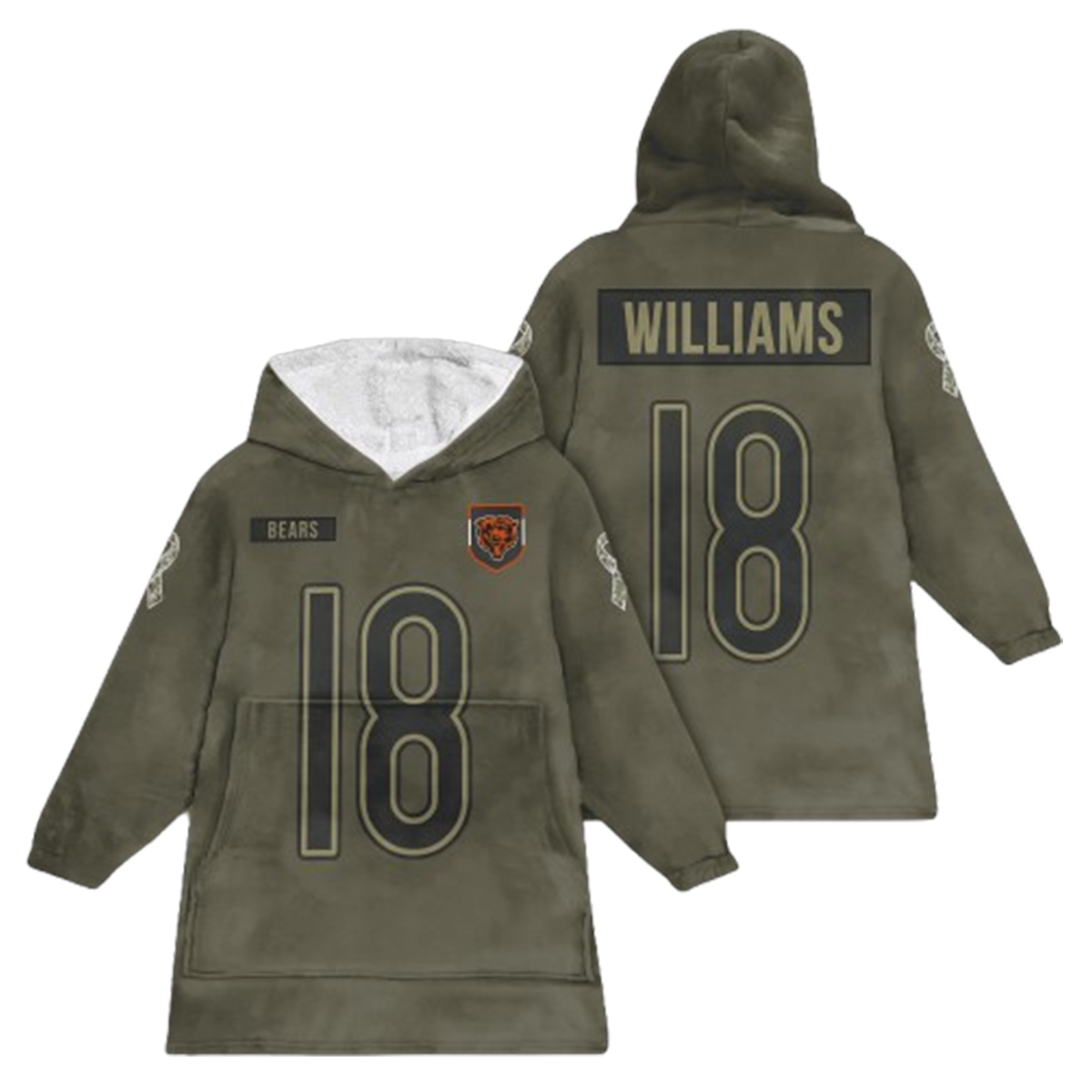 Featuring the number 18 front and back, along with WILLIAMS across the shoulders, this hoodie proudly honors a rising star. The front showcases a BEARS patch and the classic bear head logo, while both sleeves are detailed with military-style patches adding a rugged, salute to-service touch. The army green color gives it a clean, modern edge.