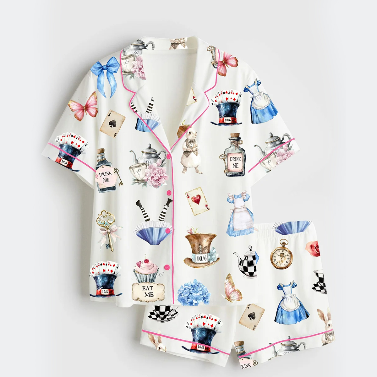 Women’s Alice In Wonderland Teapot Dress Mad Hatter Hat Tea Party Short Sleeve Satin Pajama Set