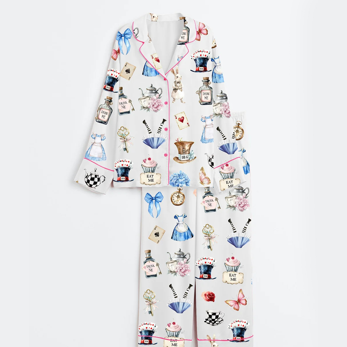 The design is enchanting from every angle. Set against a creamy satin base, it features beautifully illustrated elements straight out of Wonderland blue dresses, “Drink Me” bottles, “Eat Me” cupcakes, teapots, keys, pocket watches, playing cards, and the Mad Hatter’s signature hat. Each watercolor-style detail feels like it was painted from the pages of the story, creating a delicate balance between nostalgia and modern artistry. The pink piping adds a dainty touch, complementing the soft tones and giving the pajama set a polished, feminine finish. Crafted from silky satin, the fabric is smooth, lightweight, and wonderfully cool against the skin, perfect for unwinding after a long day or indulging in a slow, dreamy morning.