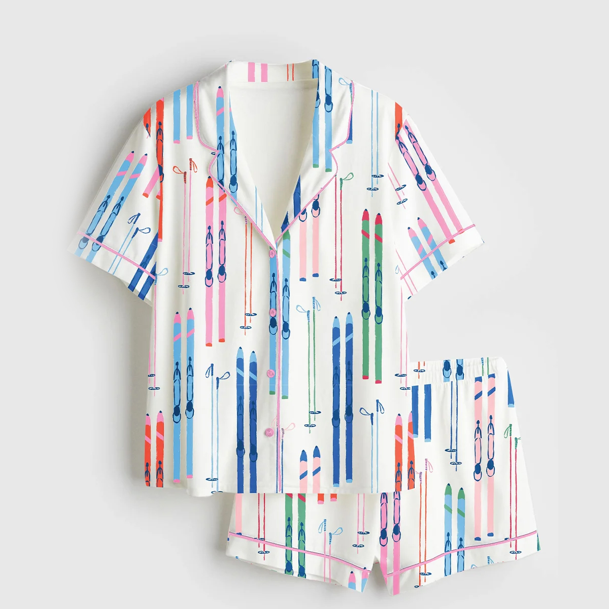 The Women’s Apres Ski Short Sleeve Satin Pajama Set features a fresh, winter-themed design filled with colorful ski poles and skis printed against a crisp white background. Shades of pink, blue, green, and orange bring a cheerful energy that mirrors the excitement of a mountain getaway. The red piping and button-up detailing add a refined touch, turning simple loungewear into something effortlessly chic.