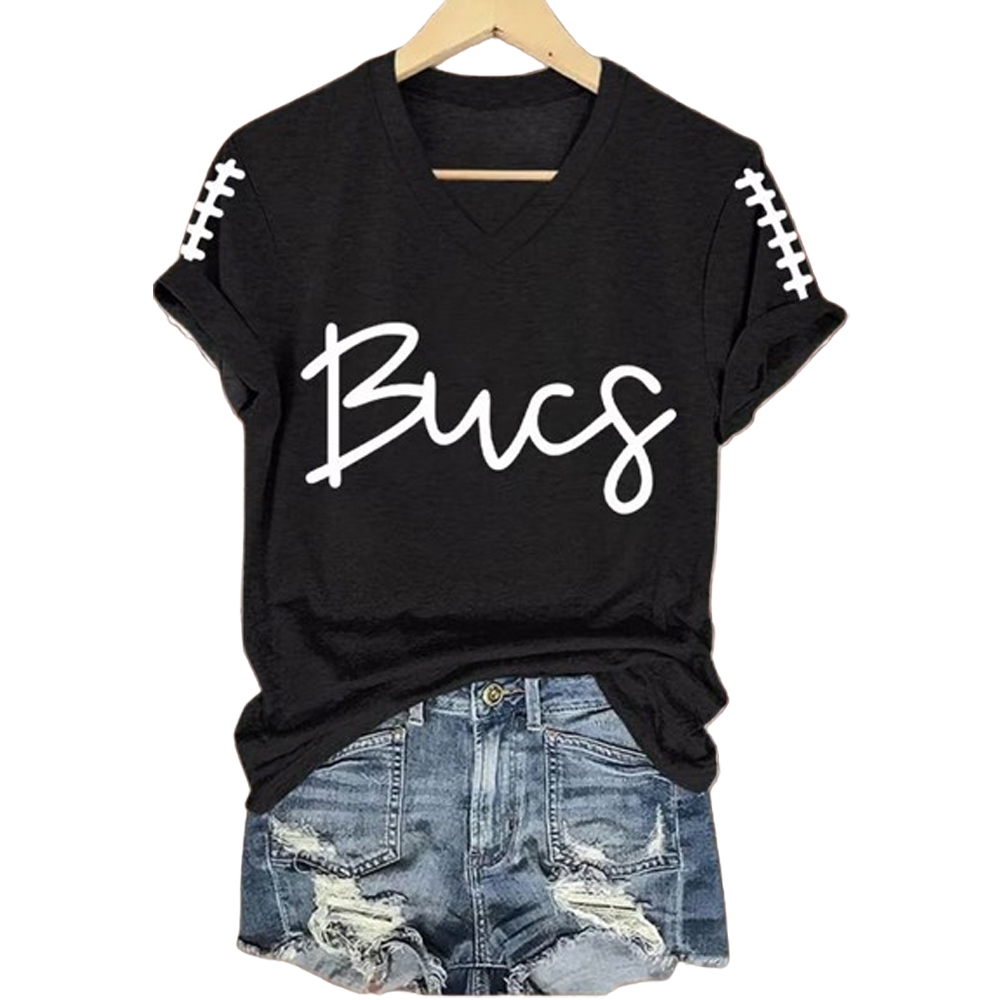 Show your team spirit in style with our Women’s Bucs Football Print V-Neck T-Shirt. This shirt is the ultimate fan gear, blending style with team pride. It’s perfect for game day, tailgating, or just showing your support around town.