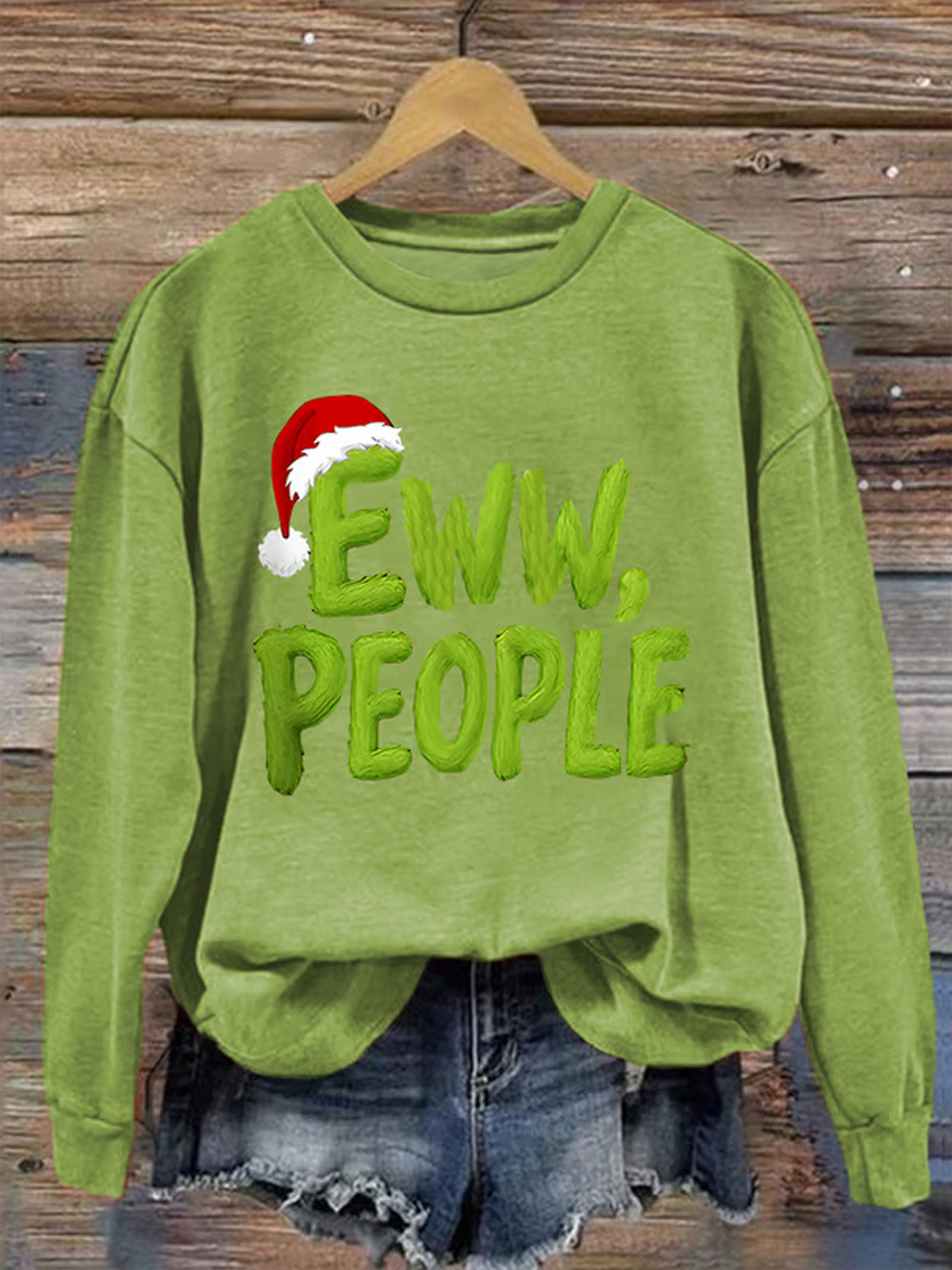 The Women’s Casual Christmas Print Sweatshirt features the bold green phrase “EWW, PEOPLE” written in a textured, brush-style font that stands out against a clean white background. The design includes a red Santa hat on the first letter, adding a cheeky festive touch that makes the shirt both humorous and seasonally stylish. The combination of Christmas cheer and sarcastic wit makes it the ultimate conversation starter for introverts and anyone who enjoys a good laugh during the holidays. Made from soft, high-quality fabric, it feels cozy and light, making it perfect for lounging at home, running errands, or attending laid-back gatherings where comfort matters most.