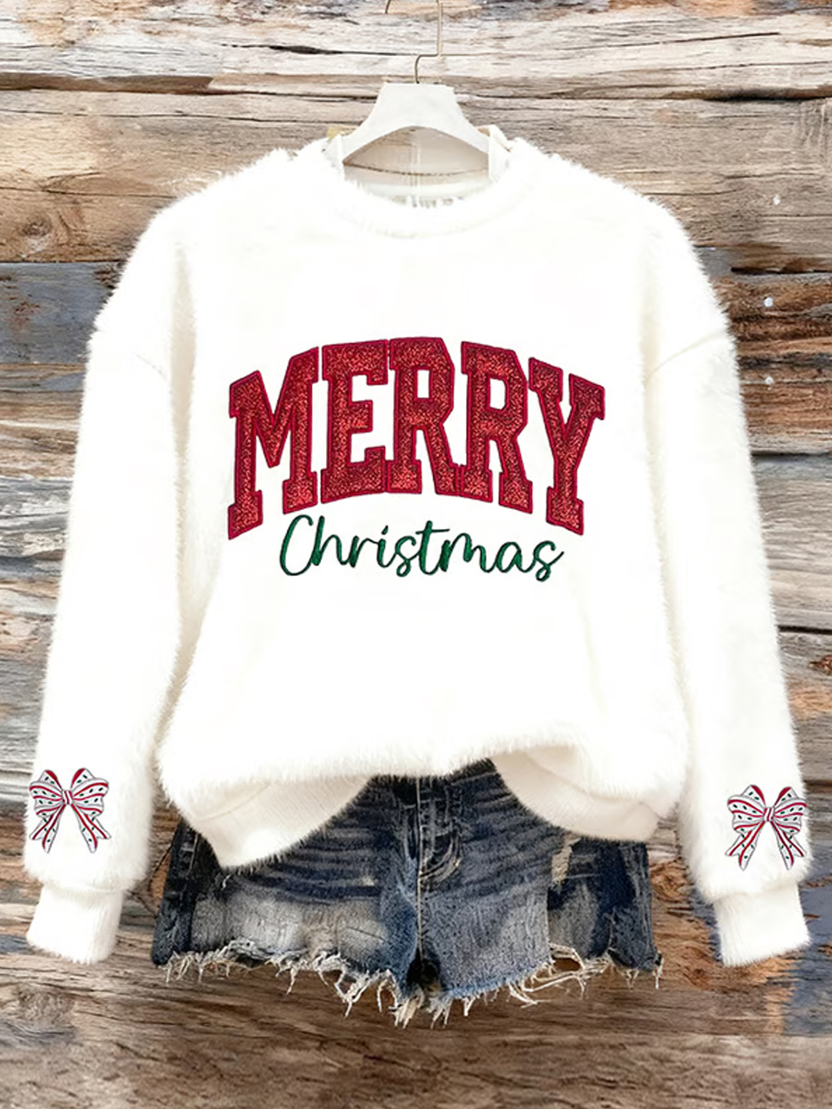 The Women’s Casual Flannel Christmas Print Long Sleeve Sweatshirt features a soft black flannel texture that feels as snug as a holiday hug. The front is boldly decorated with the sparkling red word “MERRY,” while “Christmas” is beautifully written below in elegant green script, creating a striking and heartwarming contrast. Adorable candy-cane bow details on each sleeve add a fun, festive touch, reminding you of the joyful spirit that fills December days.