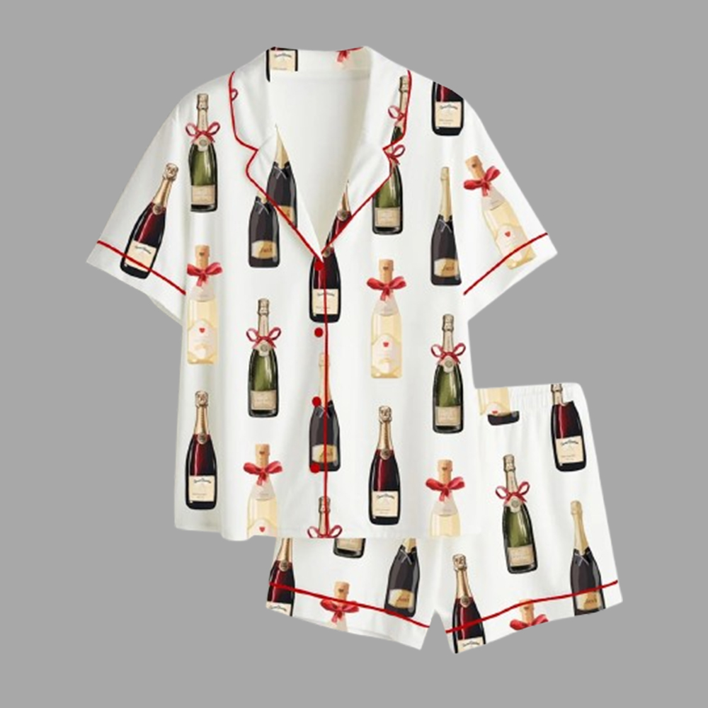 The set includes a classic short sleeved, button down top with a notched collar and matching elastic-waist shorts. The fabric drapes beautifully, offering a relaxed and comfortable fit that’s perfect for lounging. The standout feature is the unique and delightful print, which showcases an array of different champagne bottles, each adorned with a festive red bow. This specific design was inspired by a popular holiday decor trend of wrapping champagne bottles with festive ribbons to give them as gifts, a tradition that perfectly captures the spirit of giving and celebration.