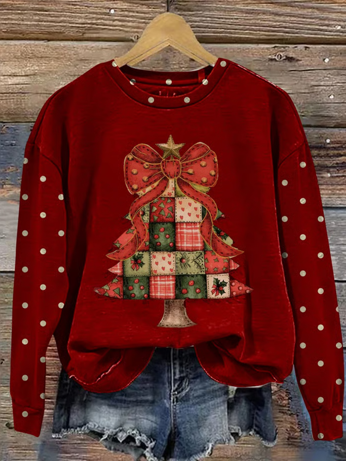 Celebrate the festive season in style with the Women’s Christmas Print Sweatshirt. This delightful sweatshirt features a cheerful Christmas tree design with patches of vibrant red, green, and gold, perfectly capturing the holiday spirit. The addition of the large bow at the top gives it a touch of elegance, while the polka dot accents on the sleeves add a playful vibe. Whether you’re cozying up for a holiday movie marathon or attending a seasonal gathering, this sweatshirt offers a combination of comfort and festive flair.