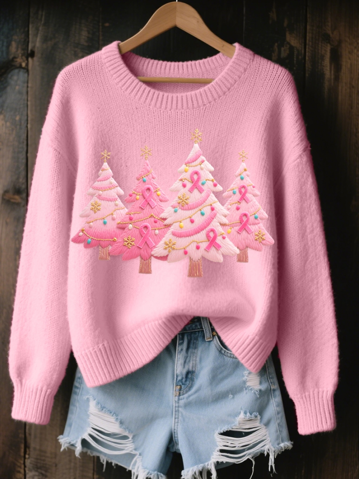 This eye-catching sweater features a soft, lovely pink hue that makes a refreshing statement compared to traditional holiday colors. The garment offers a relaxed, comforting fit with classic ribbed cuffs and neckline, ensuring you stay snug on chilly days. The main feature is the richly detailed embroidery across the chest: a whimsical row of decorated Christmas Trees. These trees are adorned with lights, gold star toppers, and a distinct palette of various shades of pink. Crucially, each tree is thoughtfully embellished with a pink ribbon, a subtle yet powerful symbol of hope, strength, and support for a vital cause.