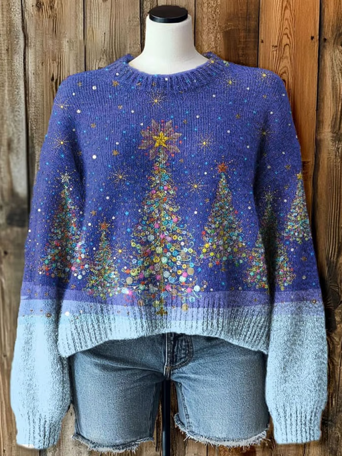 This stunning sweater features a dreamy blend of blue and lavender hues, setting the perfect wintery backdrop for its vibrant Christmas tree motif. The front is adorned with beautifully detailed trees decorated in colorful sequins and tiny lights, each topped with a golden star that shimmers with every move. The soft gradient knit transitions gently from deep twilight blue to frosty sky tones near the cuffs and hem, creating a subtle ombré effect that mirrors a peaceful winter dusk. The relaxed fit and ribbed edges make it effortlessly chic and incredibly comfortable to wear.