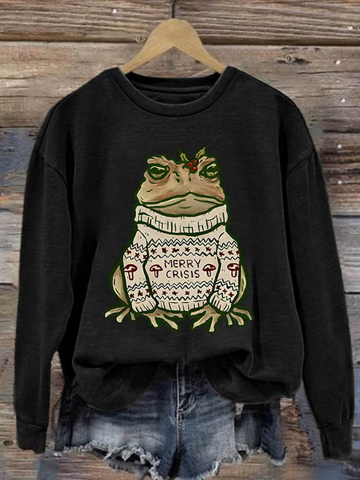 The design of the Women’s Frog Casual Christmas Print Sweatshirt features a grumpy-faced frog dressed in a knitted sweater that boldly reads “Merry Crisis.” Surrounded by whimsical mushroom patterns and cozy winter motifs, this artwork turns classic festive cheer into something refreshingly honest and relatable. It’s inspired by internet humor and the growing trend of self-aware Christmas fashion, where people express their individuality through humor instead of perfection.