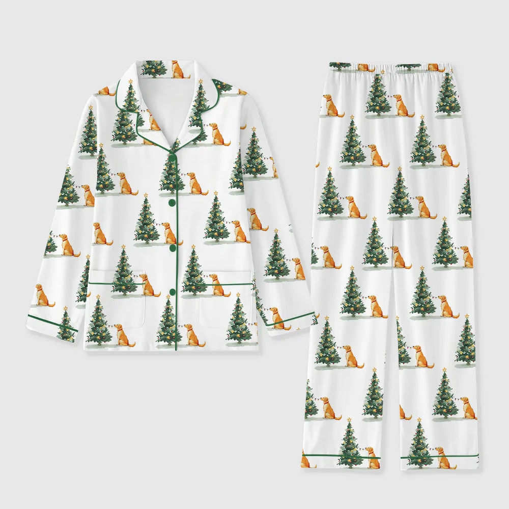 Women’s Golden Retriever With Christmas Tree Pocket Cotton Pajama Set