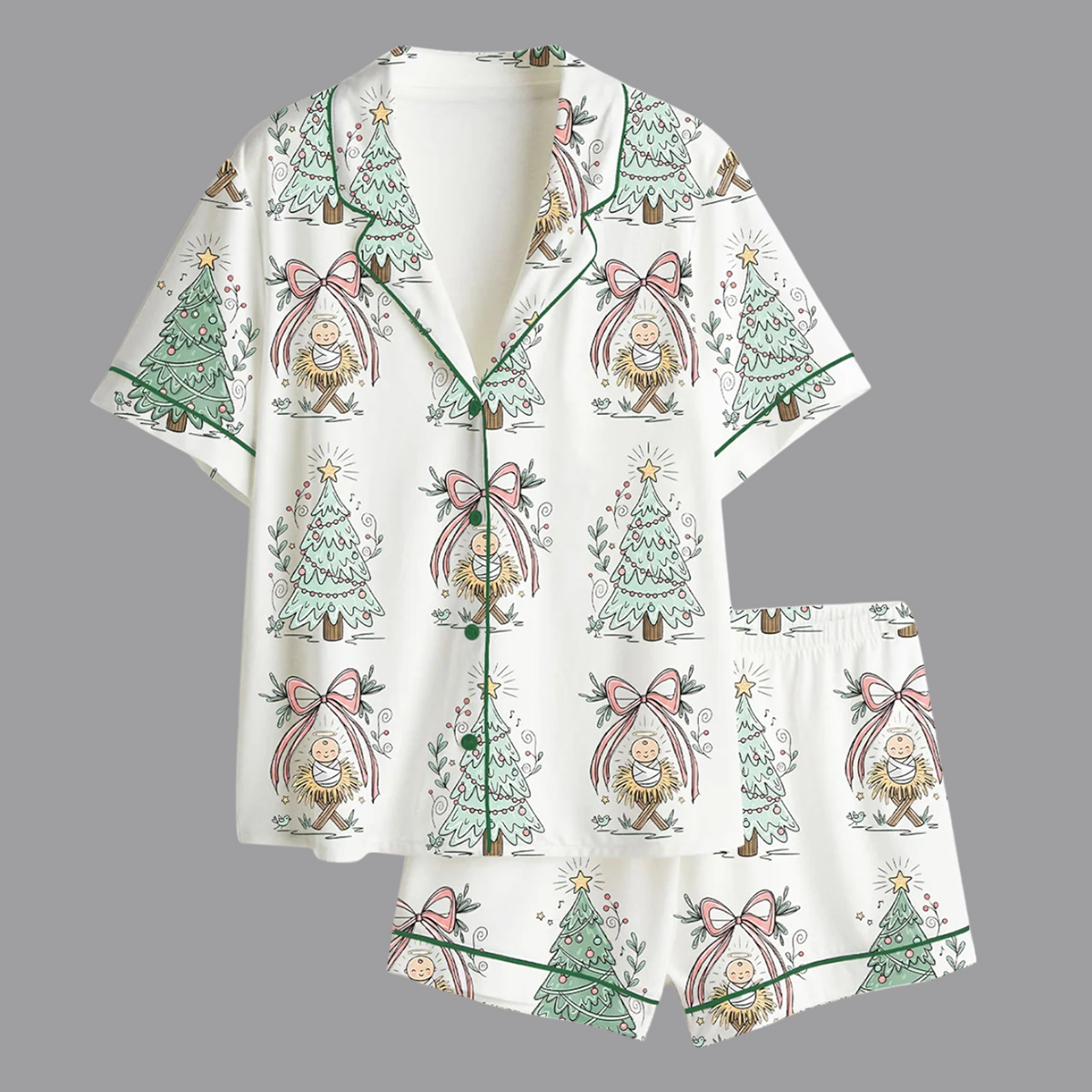 When the Christmas season arrives, it brings with it moments of reflection, joy, and faith. The Women’s Let Heaven And Nature Sing Christian Christmas Nativity Bow Trees Short Sleeve Satin Pajama Set beautifully captures that sacred spirit of the holidays.