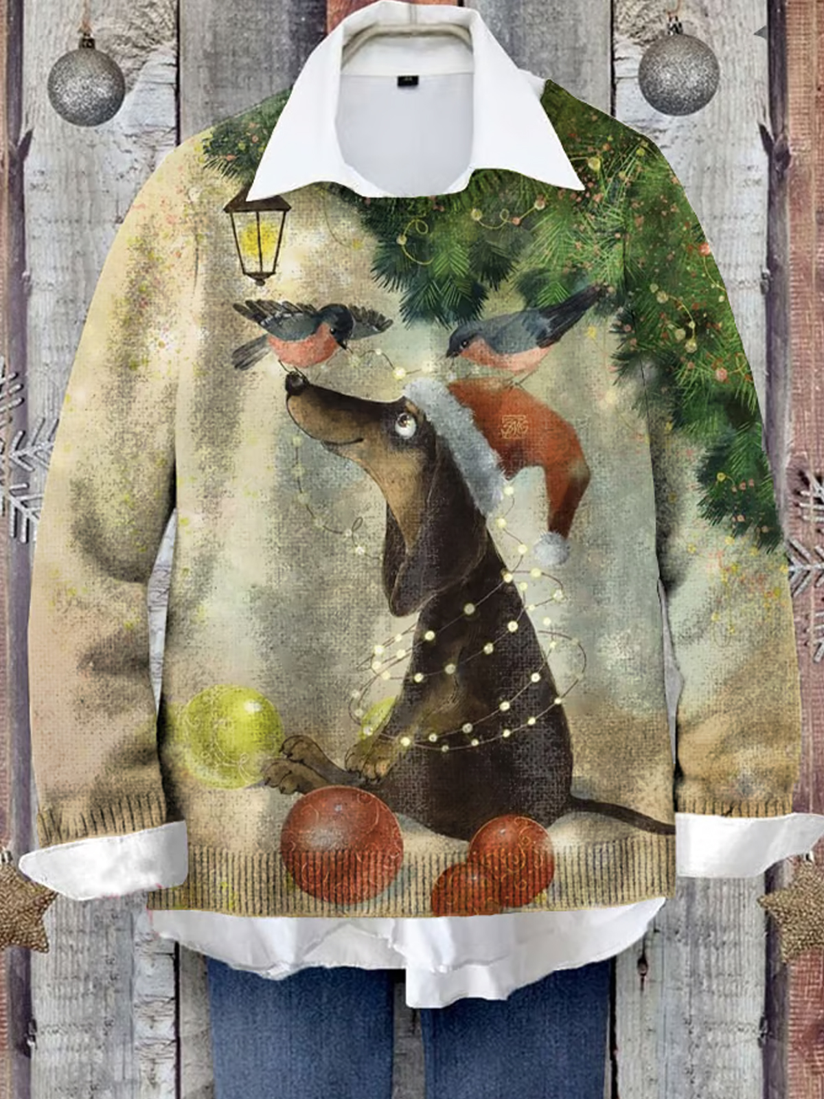 The sweater features a beautiful holiday illustration of a dachshund sitting under a snow-dusted pine garland, gazing curiously at a pair of birds perched above. Wrapped in twinkling fairy lights and topped with a Santa hat, the dachshund brings to life the cozy, storybook magic of Christmas. Accented with classic holiday ornaments in soft red and green tones, the design balances whimsy with sophistication, making it perfect for anyone who loves festive details without overdoing it. The soft beige background creates a warm, rustic look that pairs effortlessly with jeans, leggings, or winter boots.