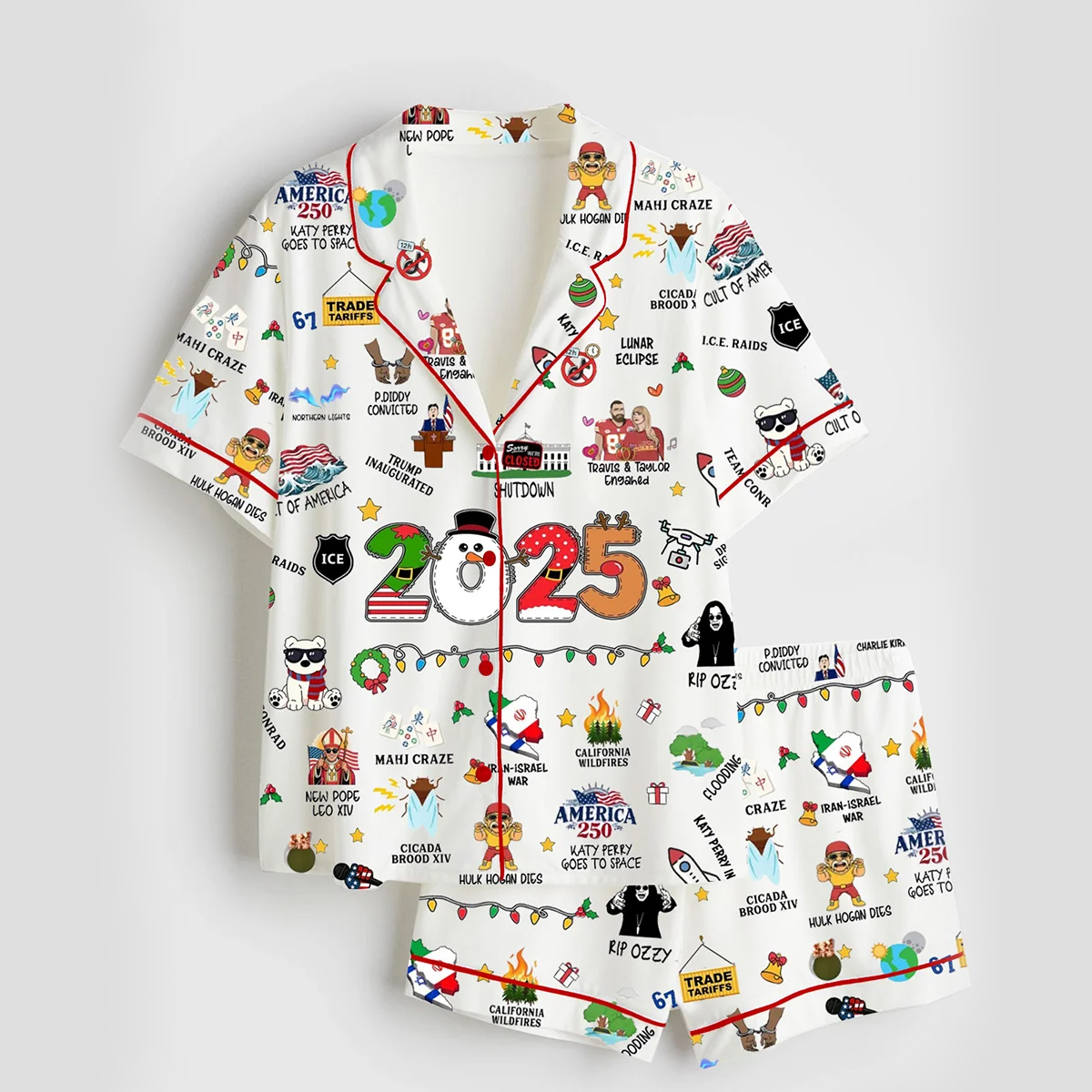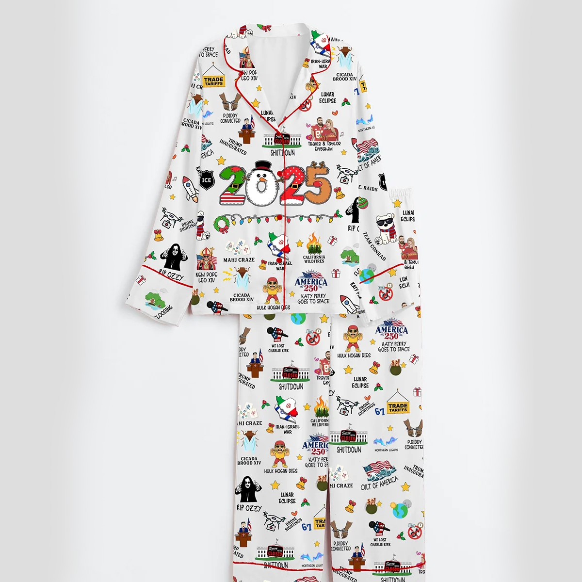 This pajama set is a celebration of both comfort and clever design. Made from soft, breathable fabric with a relaxed fit, it’s perfect for cozy nights, lazy mornings, or binge-watching your favorite end-of-year recaps. The button-up top and elastic waistband offer a classic yet modern silhouette, making it as stylish as it is snug. But what really makes it special is the storytelling, each print captures an event that shaped 2025, blending humor, history, and holiday spirit. It’s not just pajamas; it’s a wearable diary of the year’s chaos and charm.