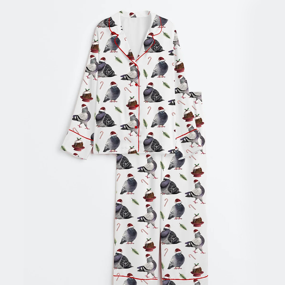 The design is as unexpected as it is adorable. Against a crisp white satin backdrop, plump pigeons proudly don their Santa hats while sitting beside traditional Christmas puddings and candy canes, creating a whimsical and distinctly British holiday feel. The red piping details along the collar and buttons add a cheerful pop of color that enhances the overall festive look. Crafted from soft, breathable satin, this set offers a luxurious yet light feel, keeping you comfortable through movie nights, lazy holiday mornings, or winter evenings by the fireplace.