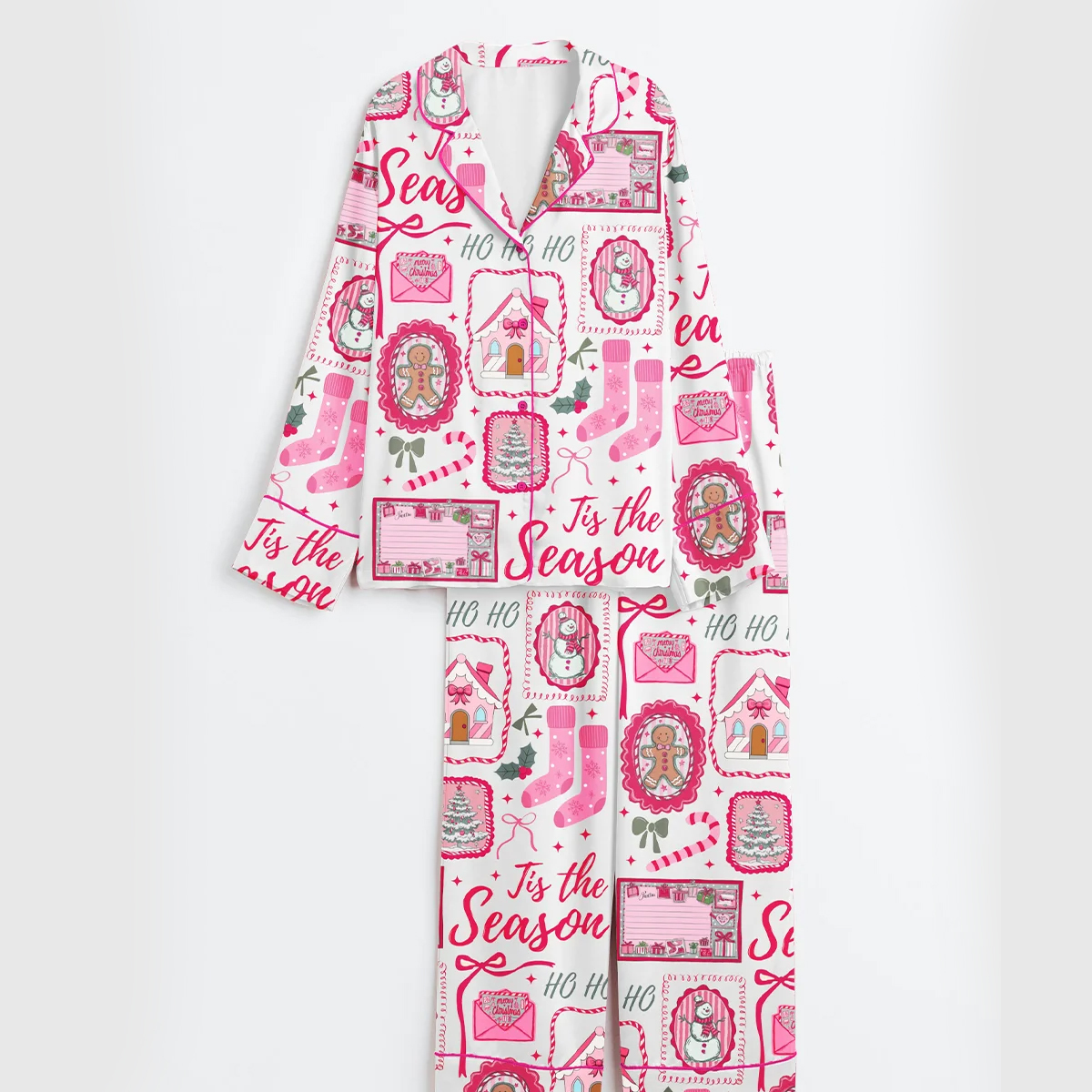 The pajama set bursts with a delightful holiday print featuring gingerbread cookies, stockings, candy canes, mistletoe, and wrapped gifts, all framed in pink, red, and white hues that instantly capture the spirit of Christmas. The words “’Tis the Season” and “Ho Ho Ho” are playfully woven throughout, giving it a joyful, storybook feel. The combination of crisp lines and sweet pastel tones creates a balance between traditional Christmas charm and a modern girly twist. Red piping around the collar and sleeves adds a touch of elegance, while the satin fabric brings a luxurious sheen that elevates your holiday lounging look.