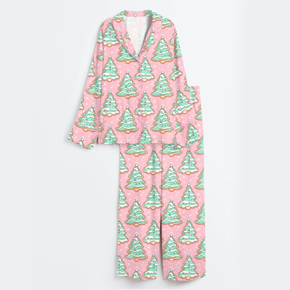 The inspiration for the Preppy Christmas Cakes print came from the idea of maximalist holiday baking. The designers wanted to create a pattern that celebrated the joy of decorating and the deliciousness of holiday treats, specifically those brightly frosted sugar cookies that are too cute to eat. The choice of the pink satin base was a deliberate move to make the traditionally festive Christmas Tree motif feel unexpectedly fun and trendy, providing a chic, girly alternative to traditional holiday pajamas.