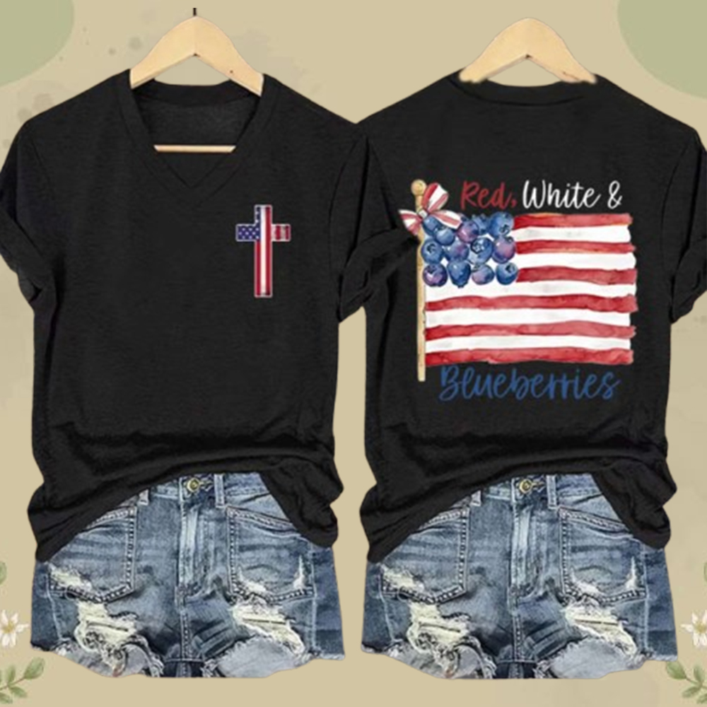Don’t settle for a plain patriotic shirt. The Women’s Red White And Blueberries Print V Neck T-shirt is a charming and meaningful way to show your love for the USA. Its beautiful design and comfortable fit make it a perfect addition to your summer wardrobe. Order yours today and wear your American pride with style!