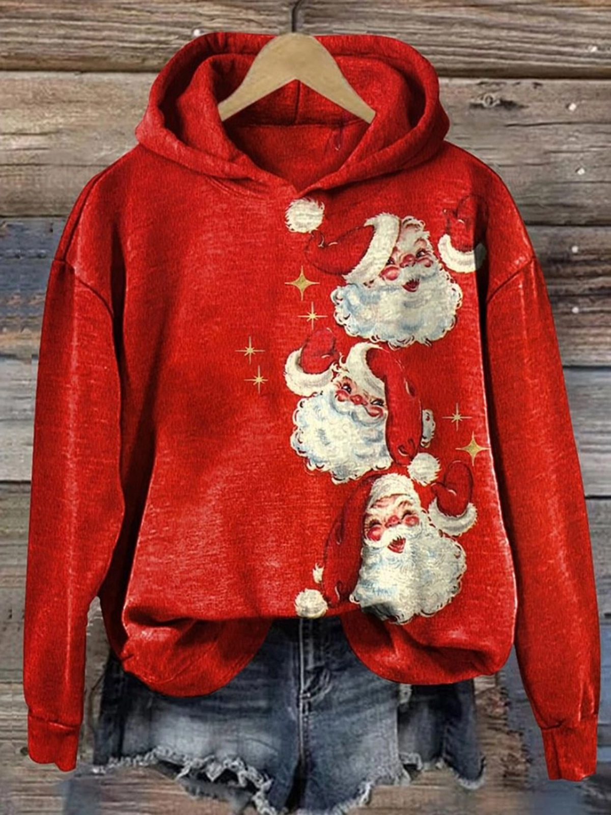 This sweatshirt features a classic red background adorned with a playful cascade of cheerful Santa faces, each one full of character and vintage-inspired detail. The artistic print captures Santa’s joyful personality with rosy cheeks, a fluffy white beard, and his signature red hat. Touches of golden stars add a subtle sparkle that enhances the festive look.