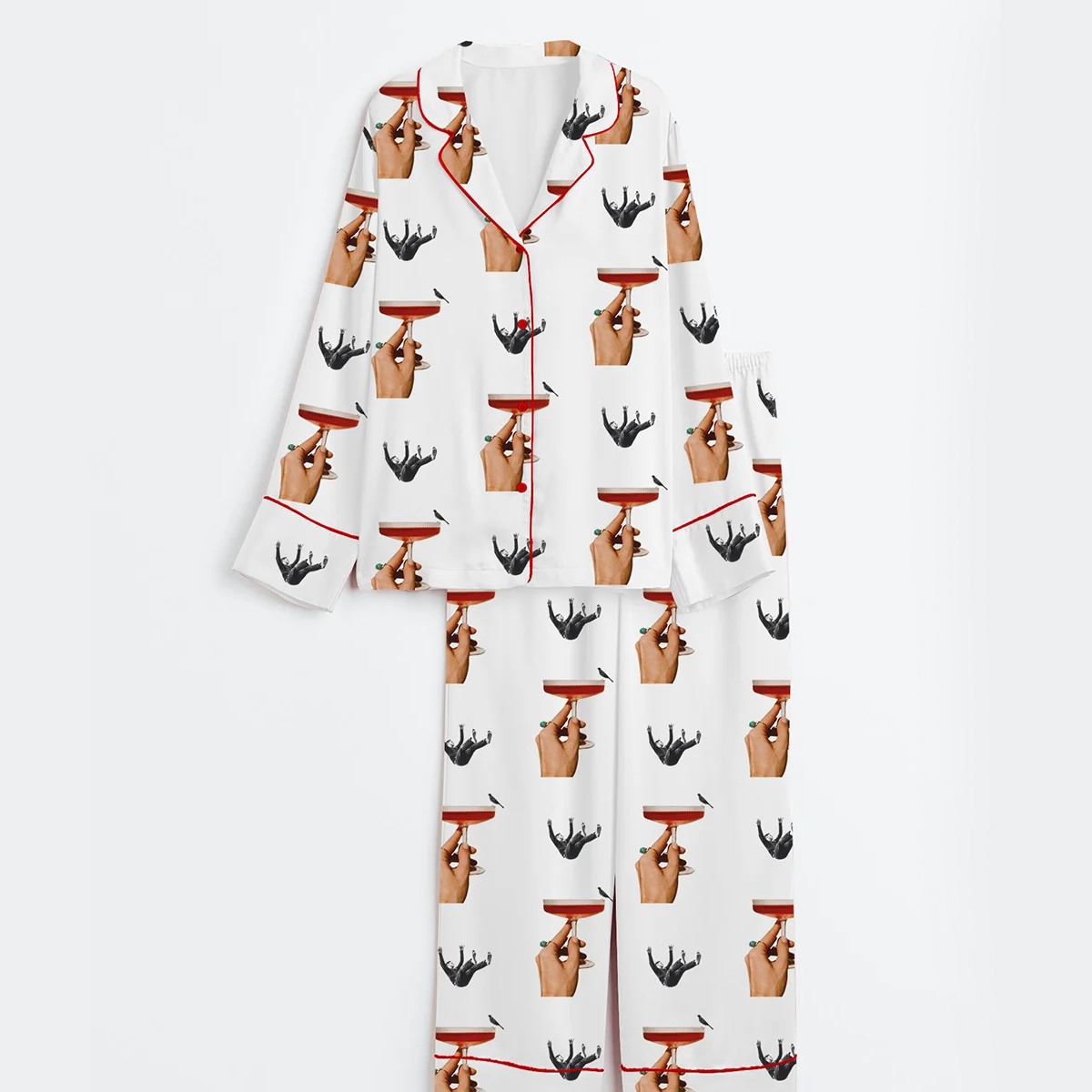 The design is striking and poetic, featuring whimsical prints of elegant hands holding cocktails, juxtaposed with floating silhouettes that feel straight out of a surrealist painting. The creamy white background enhances the artwork’s contrast, while the red piping and matching buttons add a touch of retro refinement. It’s chic, bold, and thought-provoking — an ode to vintage cocktail culture and the artistic freedom of the 20th century, brought into modern loungewear.